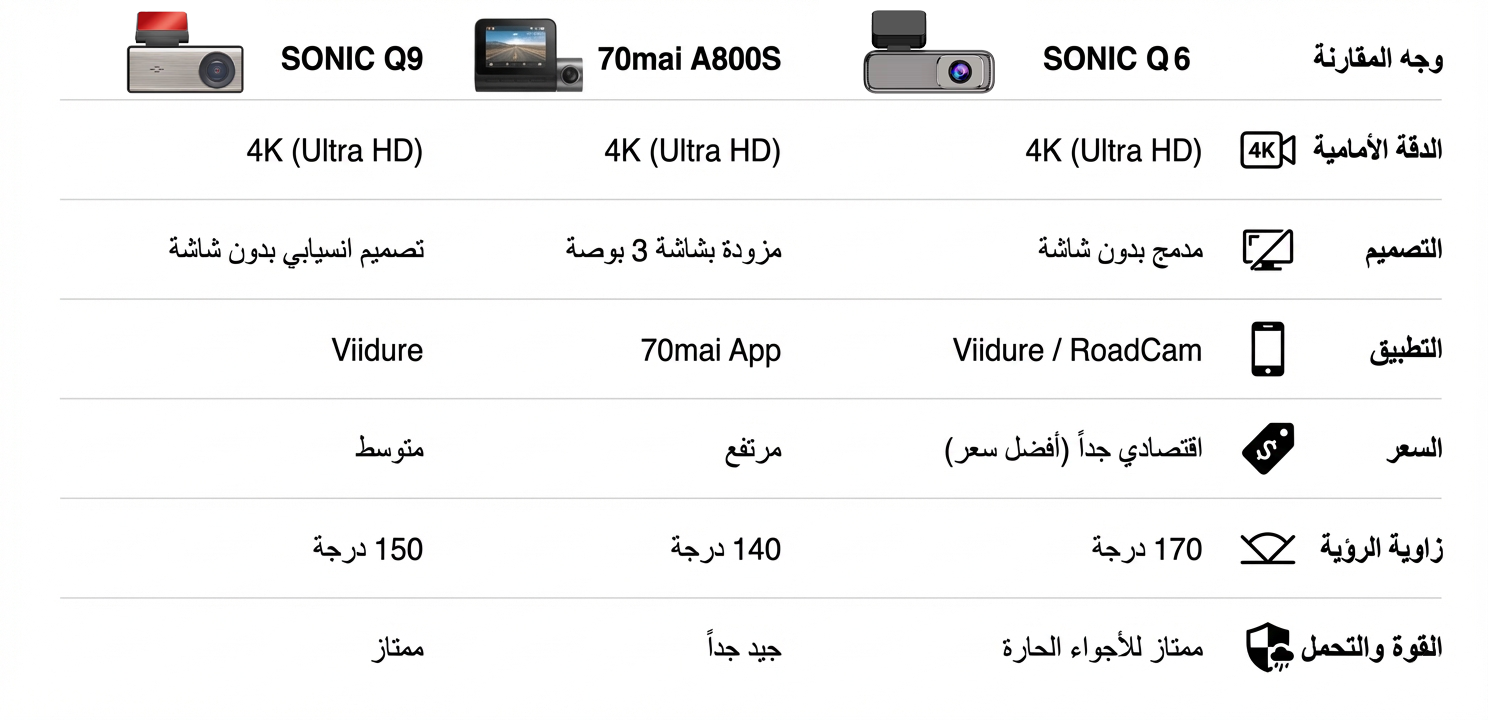 جدول مقارنة: SONIC Q6 vs 70mai vs SONIC Q9