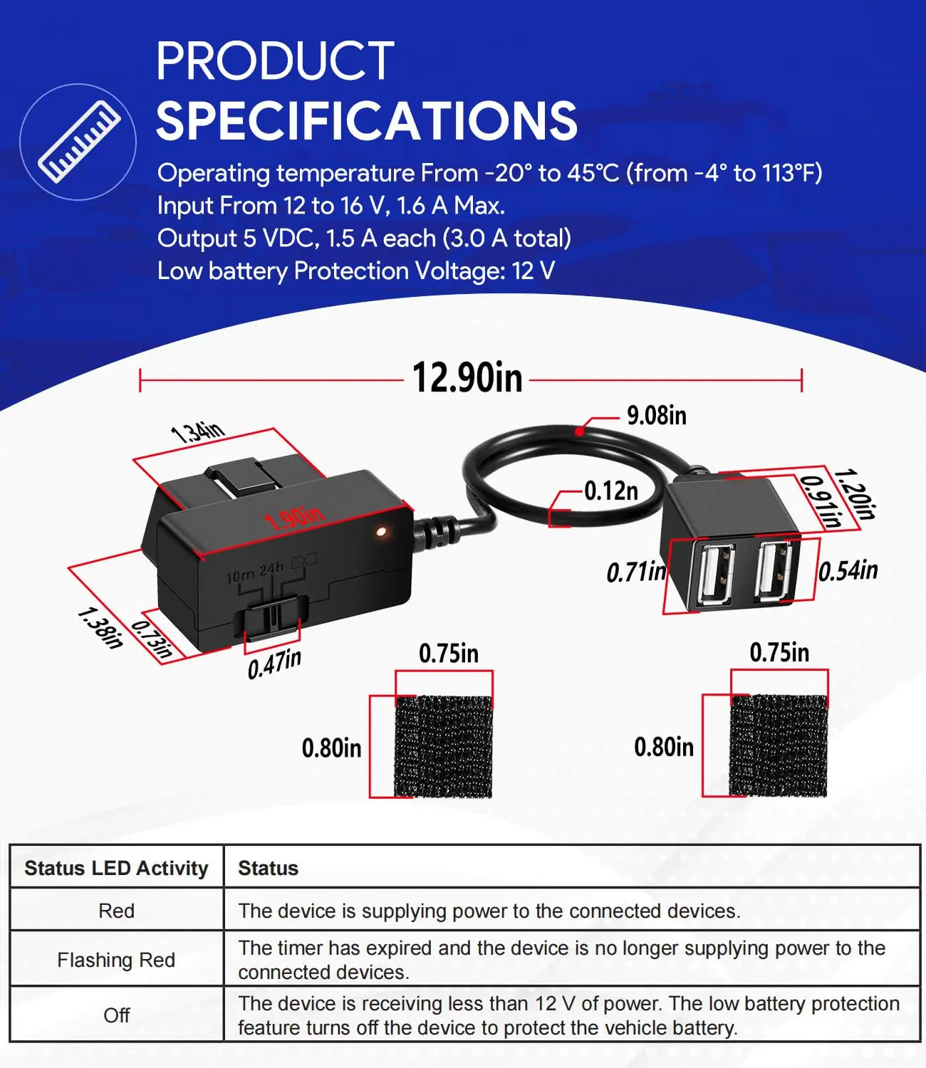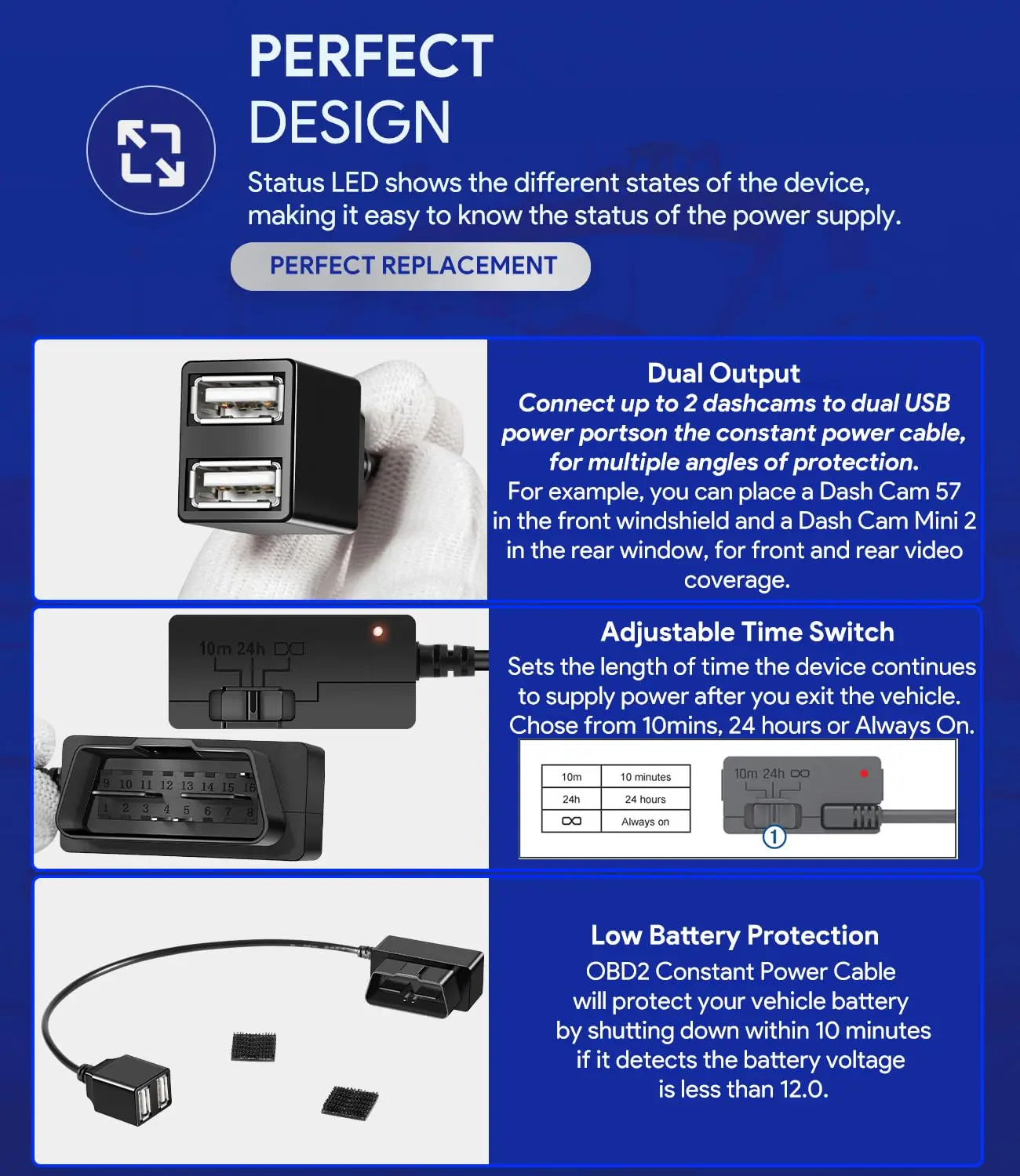 【 ميزة خاصة 】 حماية منخفضة للبطارية: ساعد على مراقبة جهد بطارية السيارة وقم بإيقاف تشغيل كابل الطاقة الثابت عندما تصل بطارية السيارة إلى 12 فولت. . مخرج مزدوج: قم بتوصيل ما يصل إلى كاميرتين لوحة العدادات بمنافذ طاقة USB المزدوجة ، للحصول على زوايا حماية متعددة. . مفتاح الوقت: اضبط طول الوقت الذي يستمر فيه الجهاز في توفير الطاقة بعد الخروج من السيارة. اختر من 10 دقائق أو 24 ساعة أو دائمًا. . حالة الصمام تظهر حالات مختلفة من إمدادات الطاقة للجهاز.