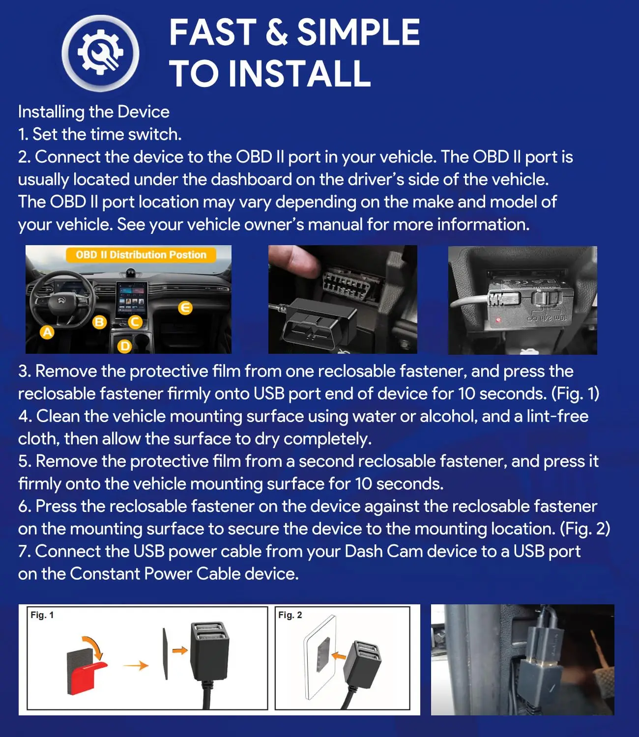 【 التوصيل والتشغيل البسيط 】 بمجرد تثبيت الكابل (ببساطة "التوصيل والتشغيل") في منفذ التشخيص بسهولة للسيارة ، ستتلقى كاميرا القيادة المتوافقة الطاقة في جميع الأوقات ، حتى عندما تكون سيارتك خارج ، حتى تتمكن من الراحة بسهولة. استمتع بالحماية من خلال كابل الطاقة الثابت الجديد!