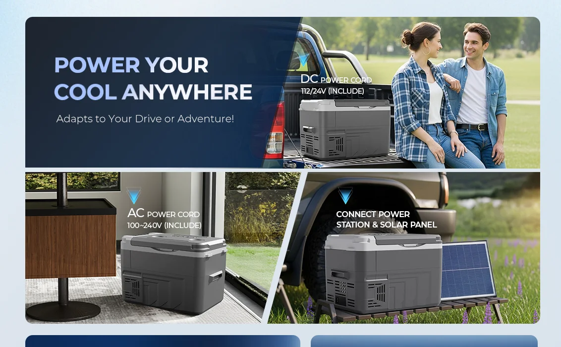 يعمل على تيار مستمر 12/24 فولت وتيار متردد 110-240 فولت، مما يجعله مناسبًا للشاحنات، والشاحنات الصغيرة، والمنازل المتنقلة، والمخيمات، وسيارات الدفع الرباعي، والاستخدام المنزلي.