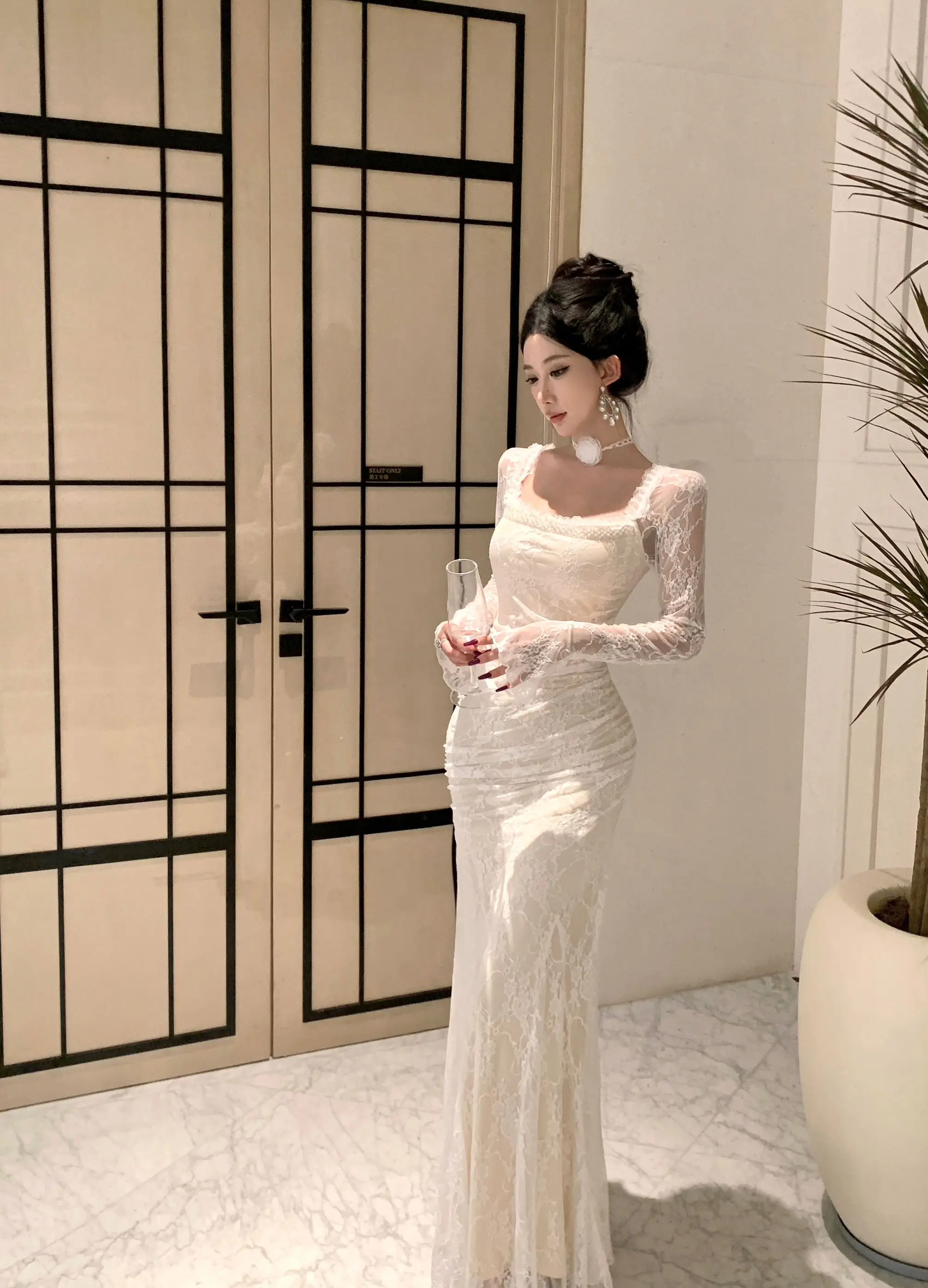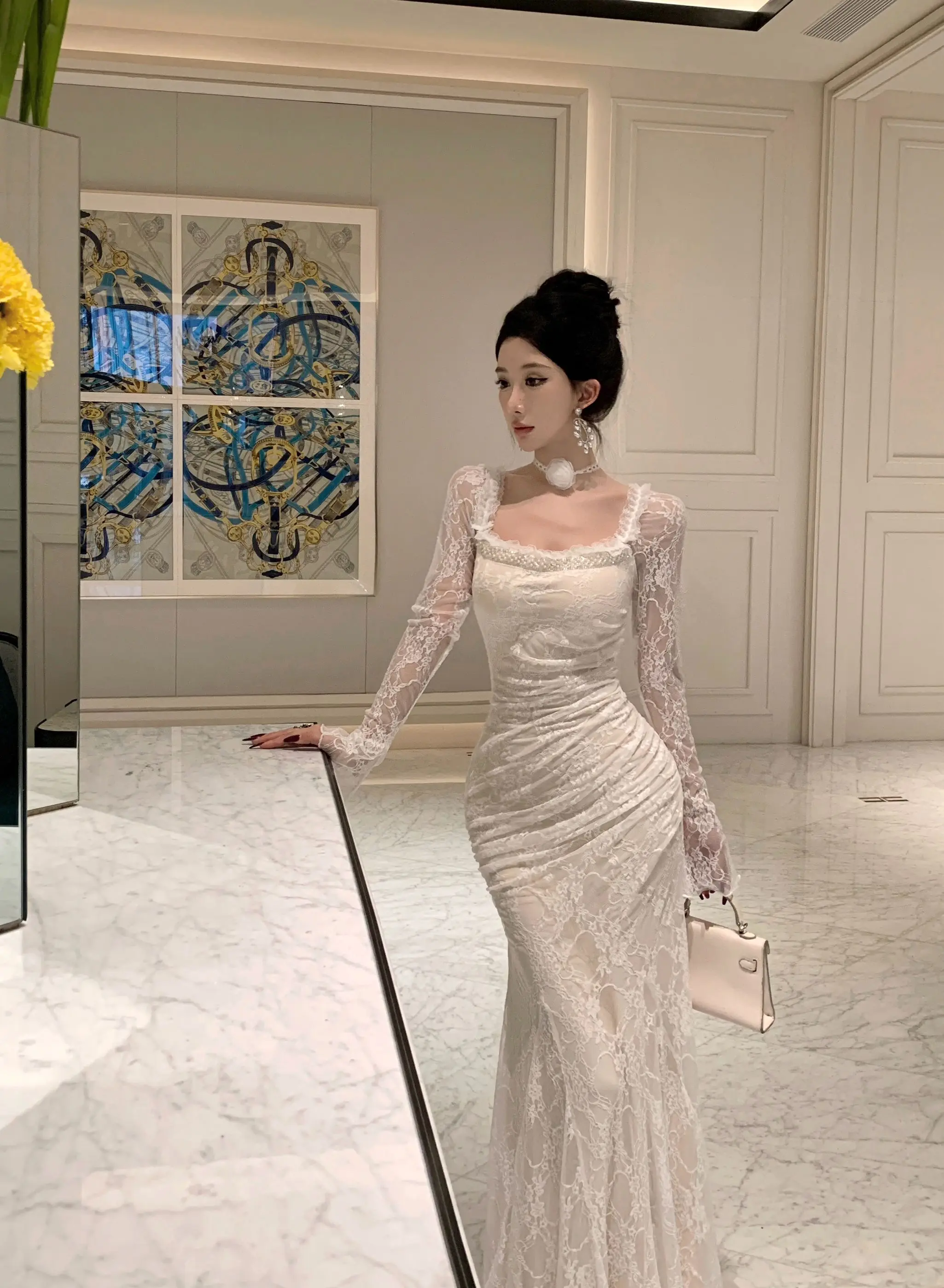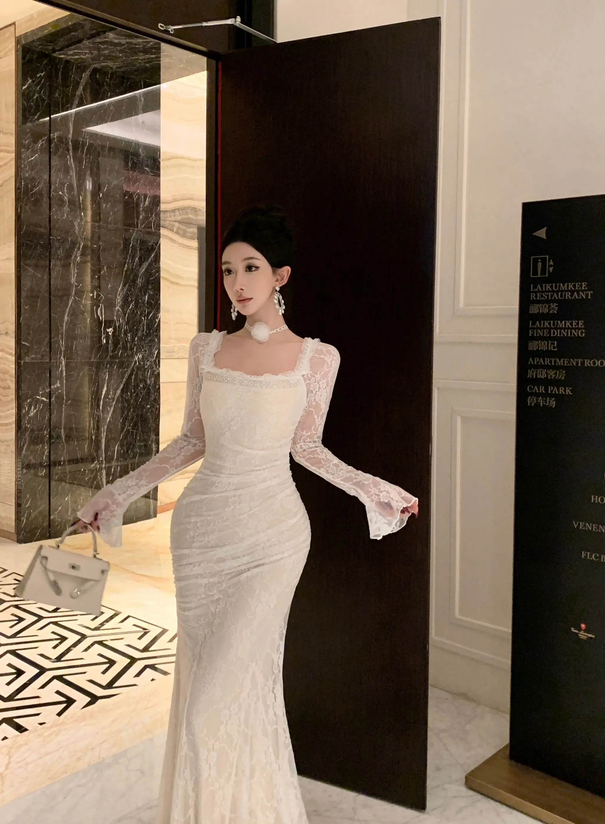 - فستان سهرة فاخر أنيق للسيدات على الموضة الكورية للخريف والشتاء فستان بياقة مربعة من الدانتيل الأبيض الماسي 2025 فساتين حورية البحر أنيقة