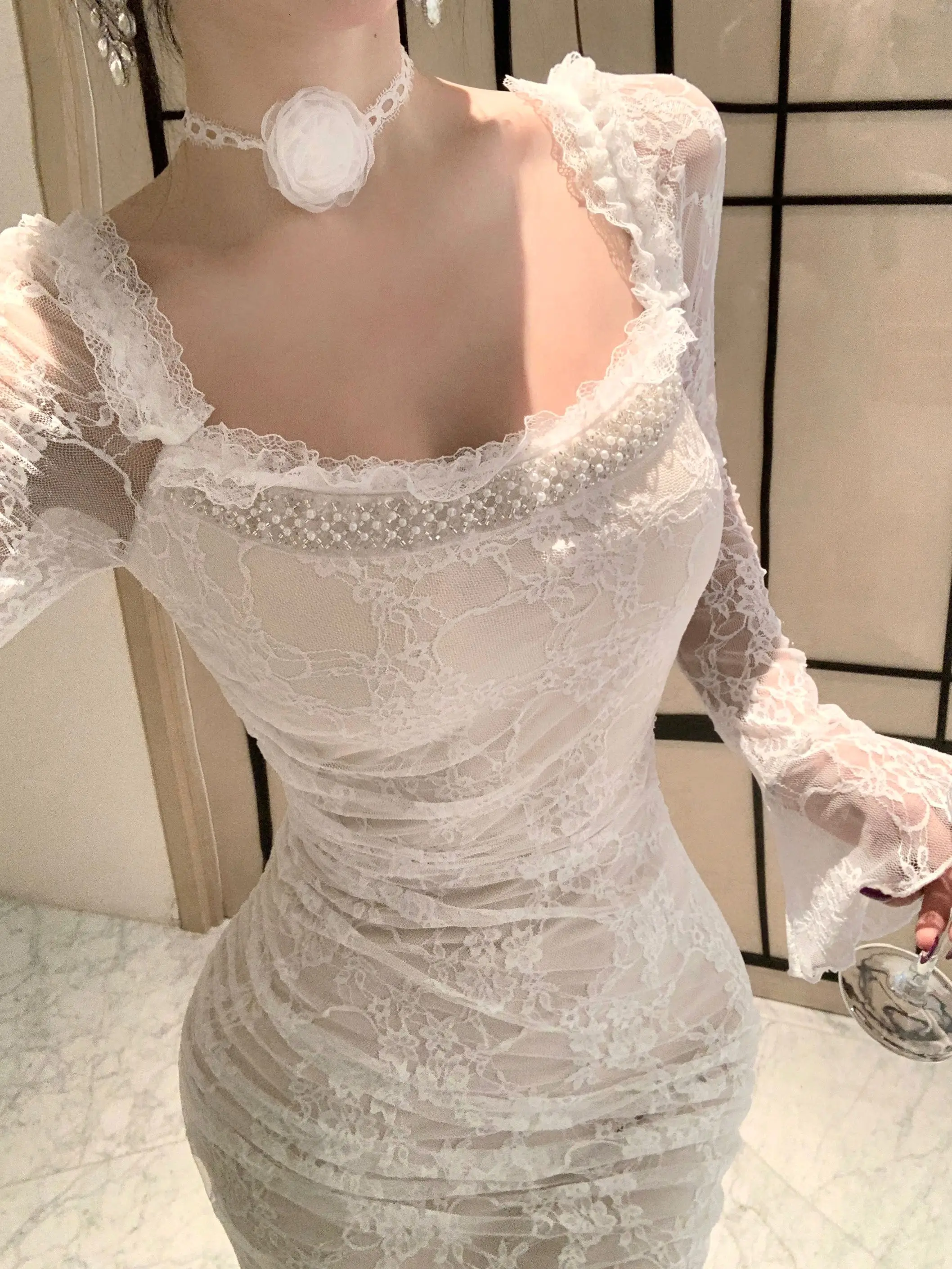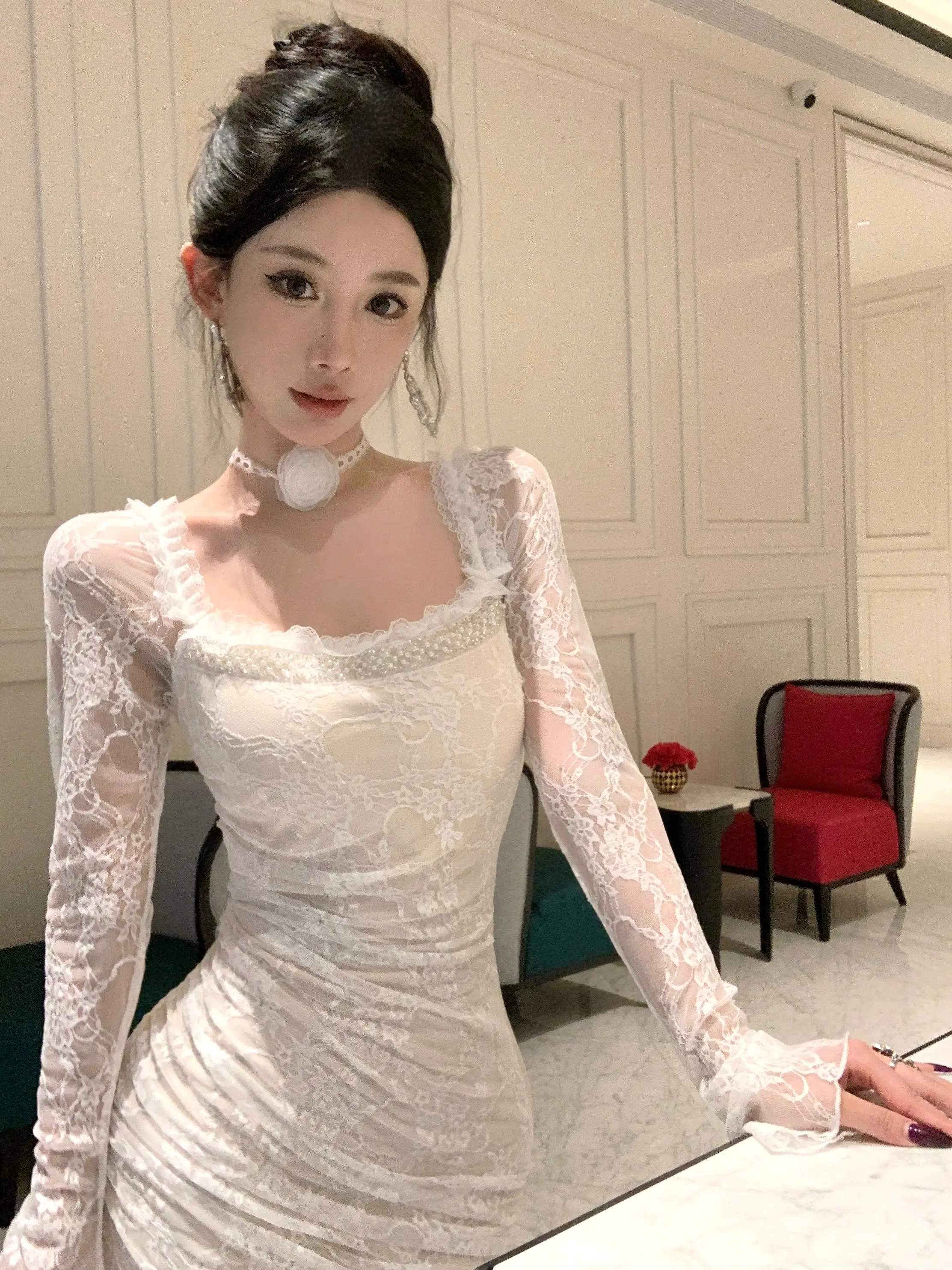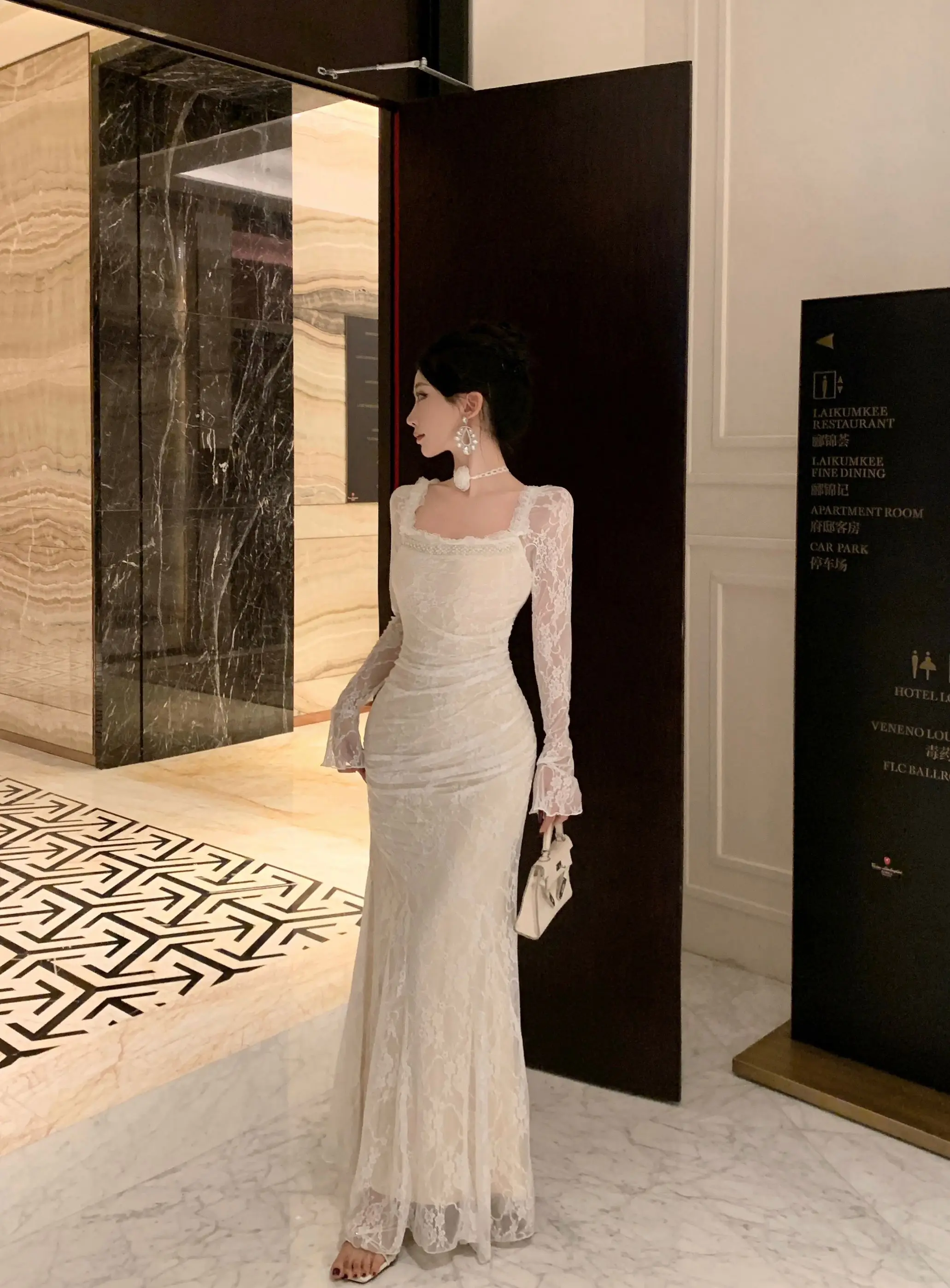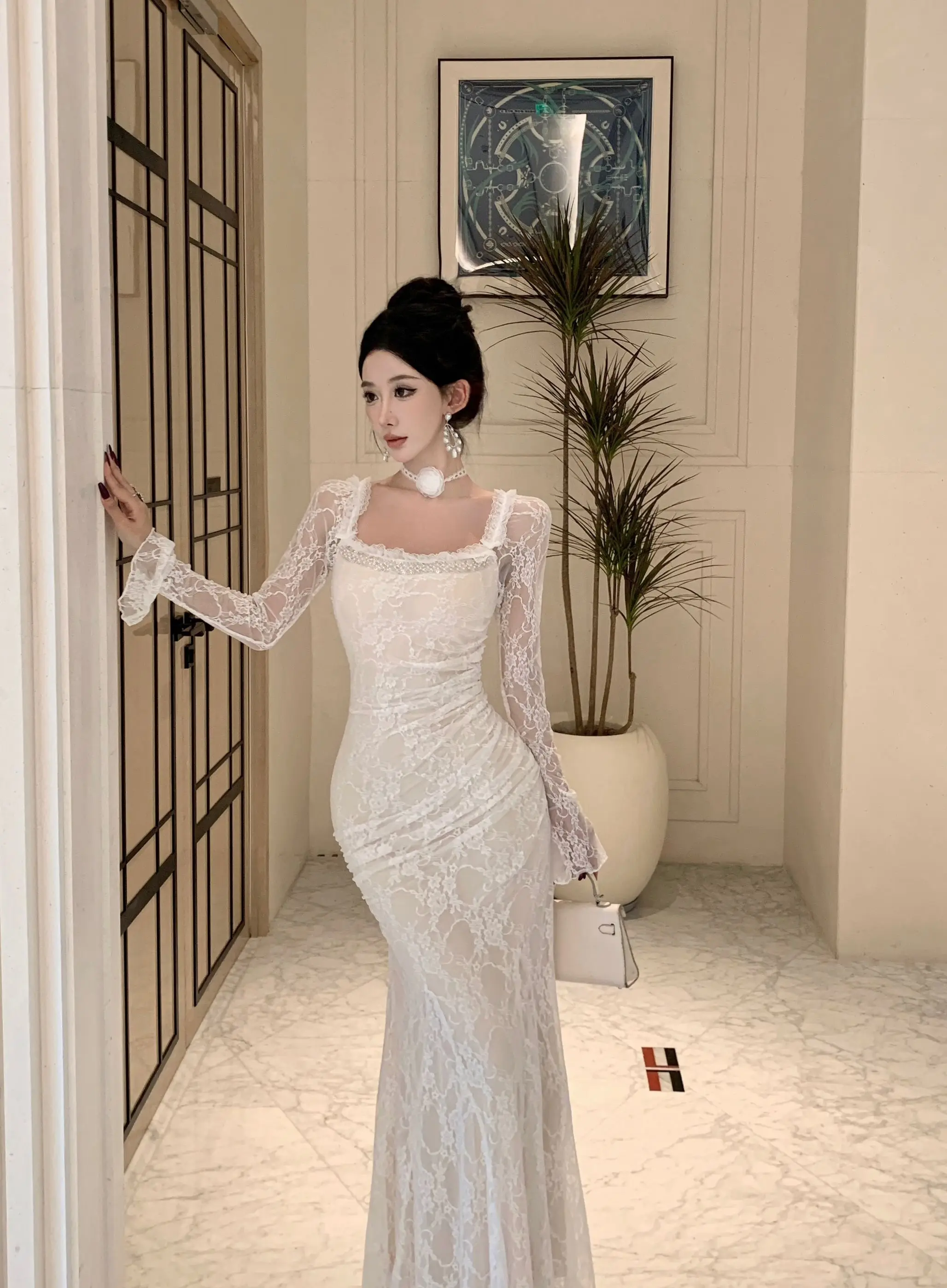 - فستان سهرة فاخر أنيق للسيدات على الموضة الكورية للخريف والشتاء فستان بياقة مربعة من الدانتيل الأبيض الماسي 2025 فساتين حورية البحر أنيقة