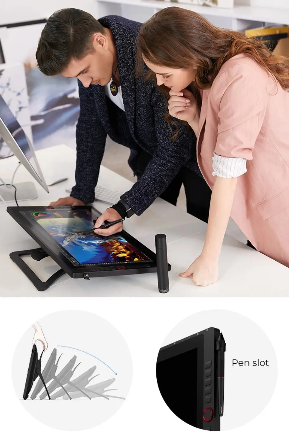 With the Artist 22R Pro's integrated adjustable stand, you can change your working angle to suit your various needs of creating more easily and quickly. And the specially-designed pen slot on the front side provides quick and safe access to your pen.