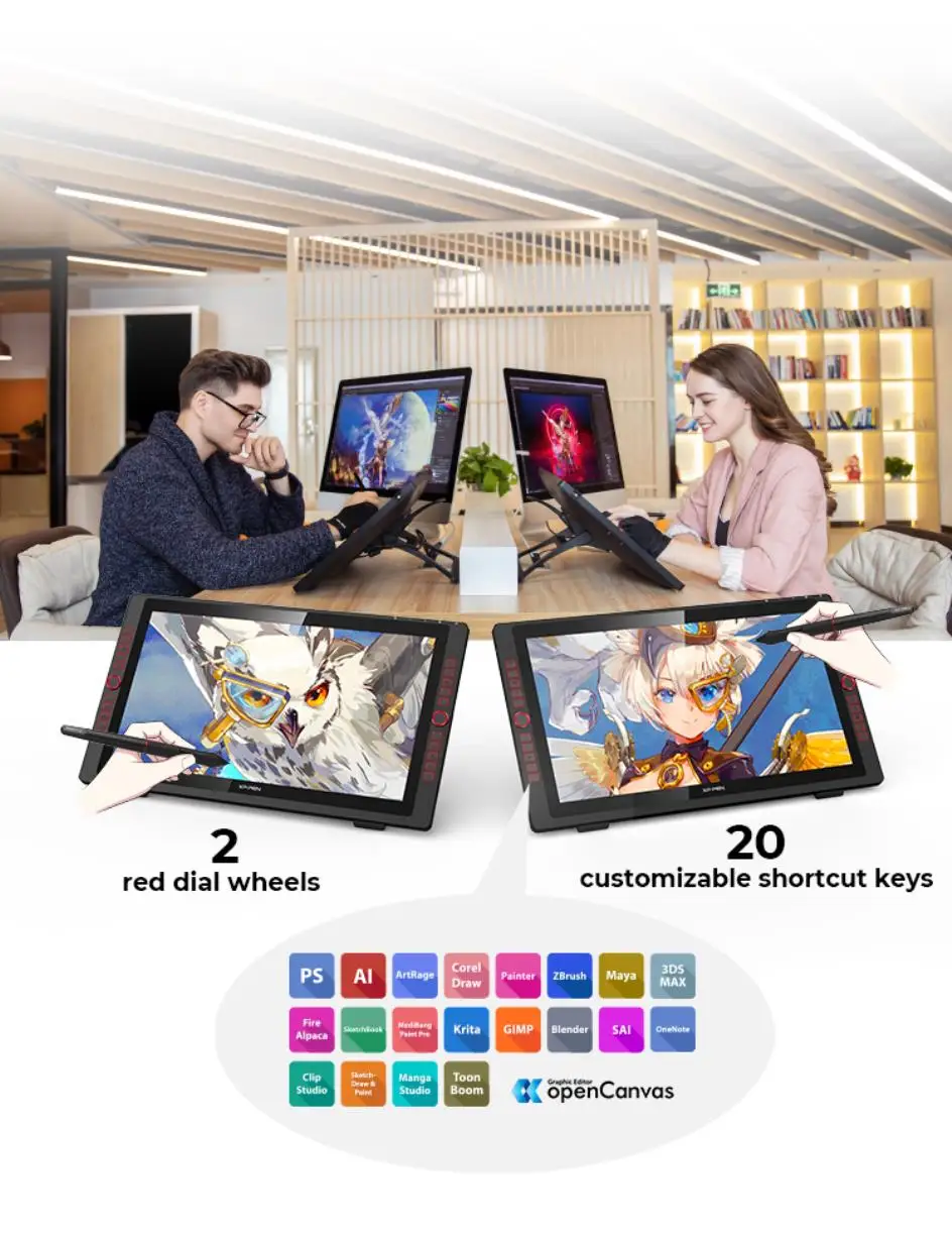 The XPPen Artist 22R Pro features two easytocontrol red dial wheels and 20 customizable shortcut keys that are conveniently placed on both sides making it equally accessible for left and right-handed users.
