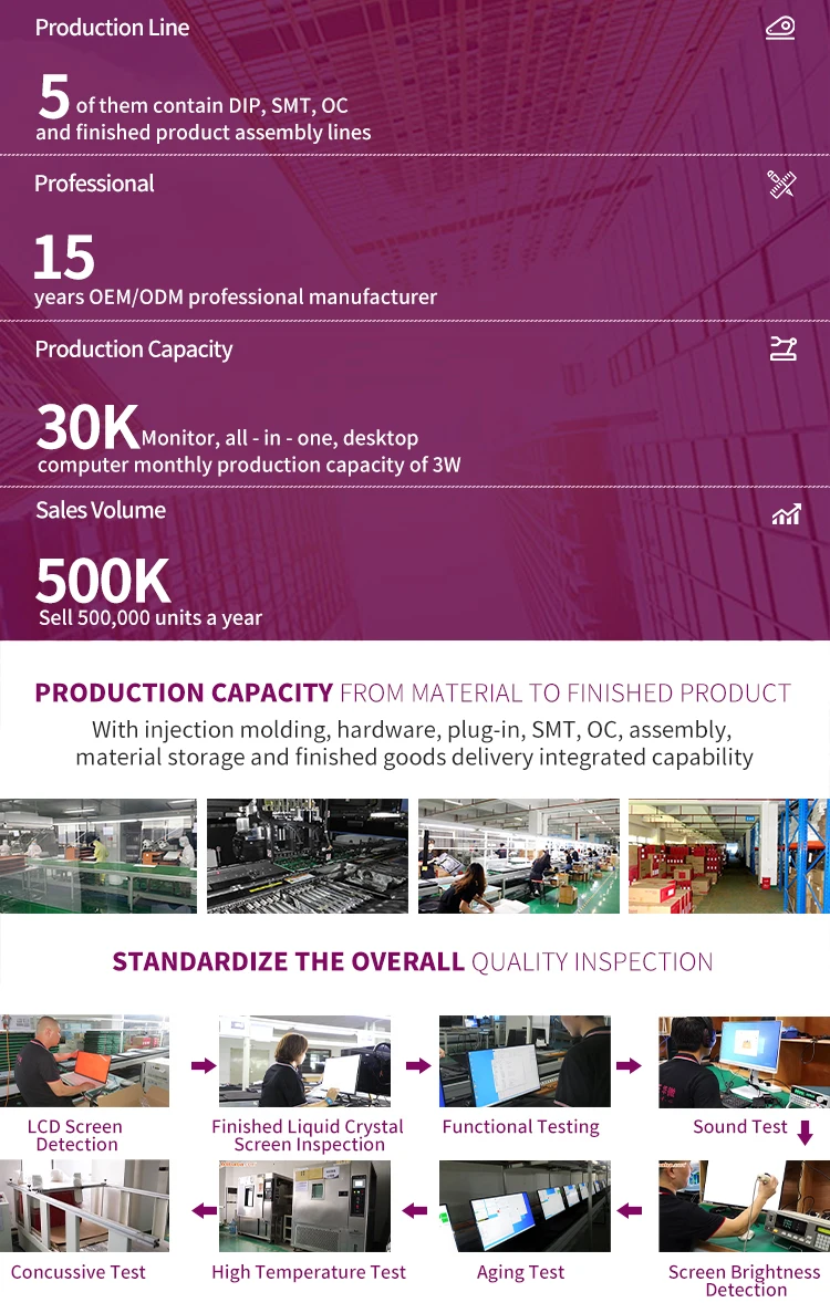 --> نحن منخرطون في إنتاج الكل في جهاز كمبيوتر واحد، وجهاز كمبيوتر صغير، وشاشة SSD وذاكرة الوصول العشوائي لمدة عشر سنوات.نحن الشريك المعتمد رسميًا لشركة Intel وFounder.لدينا قدرة قوية على البحث والتطوير، ونقوم بتطوير أكثر من 100 منتج جديد كل عام.اجتاز المصنع ISO9001 وISO140001 شهادة، لديها سمعة طيبة من حيث الجودة.نحن نقدم خدمة طويلة الأمد لأوروبا وأمريكا وأكثر من 30 منطقة من العلامات التجارية الكبرى المحلية في آسيا.سعة الشحن الشهرية 200 ألف.يمكننا تلبية جميع احتياجاتك ونكون أفضل شريك لك.