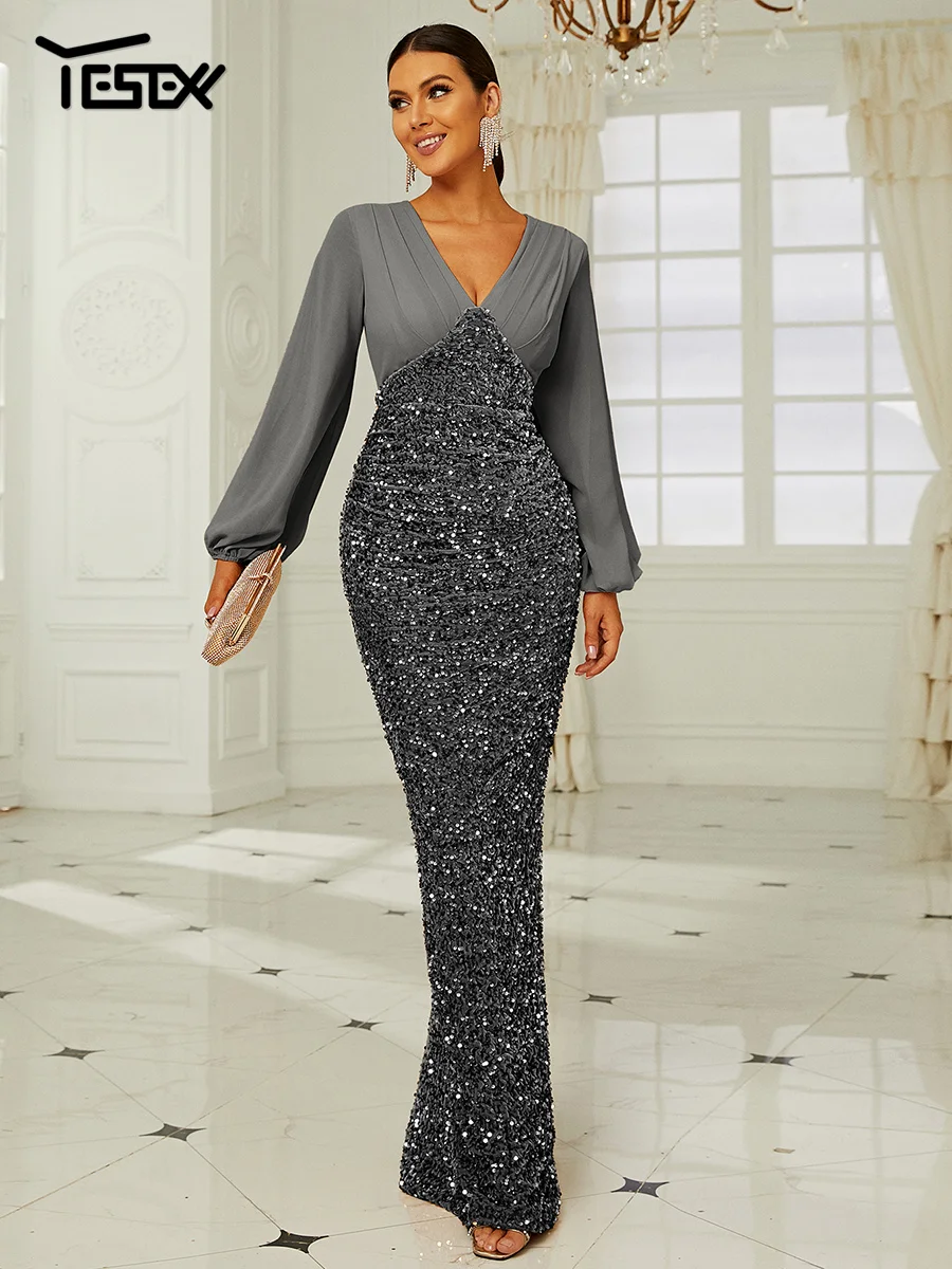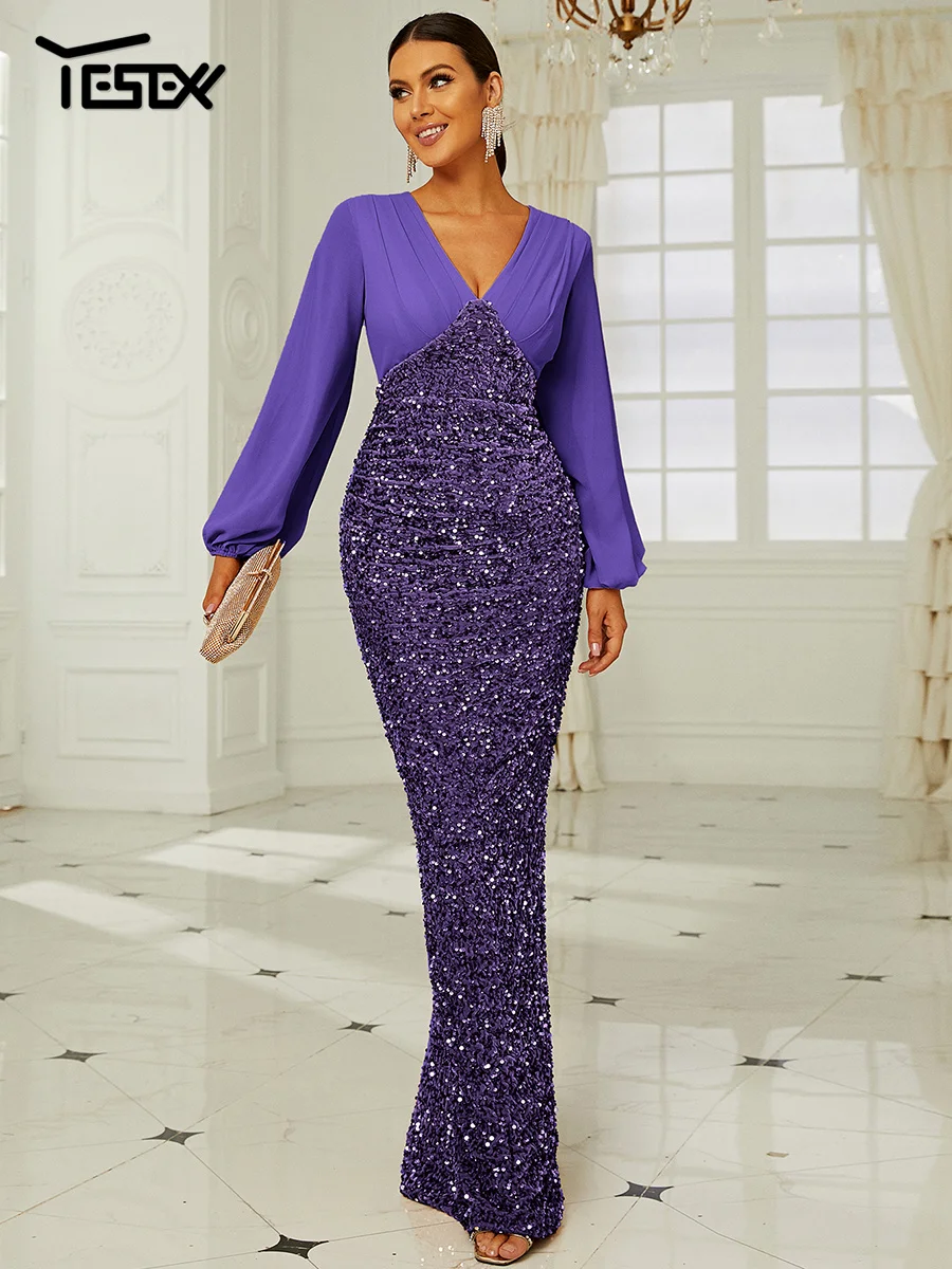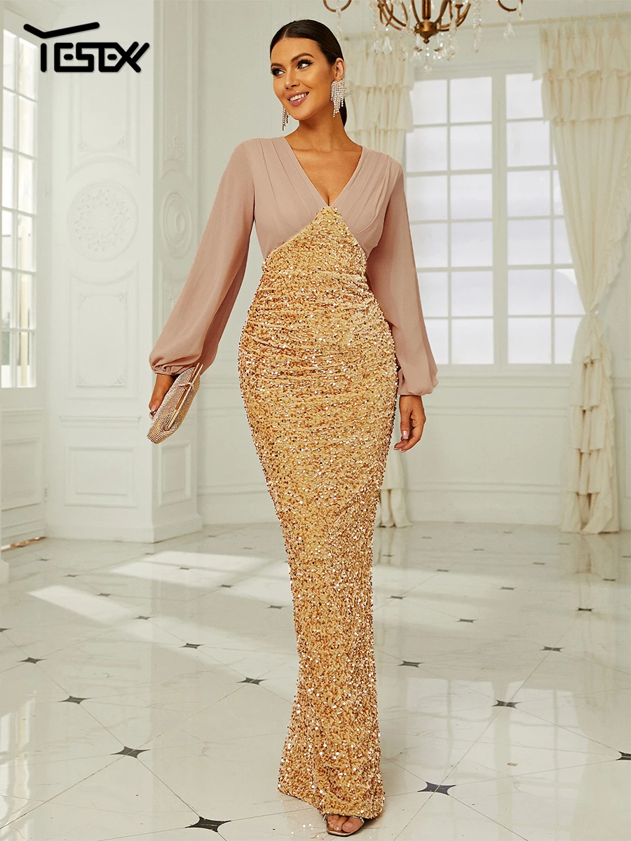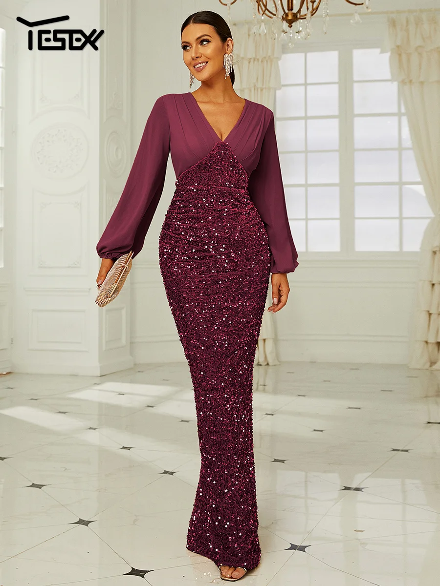 - فستان نسائي Yesexy فستان رسمي بحافة حورية البحر وأكمام فانوس ترتر متباين فستان سهرة أنيق أنيق فساتين رداء