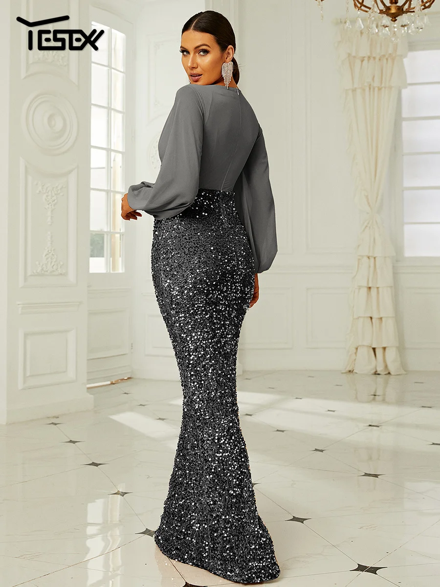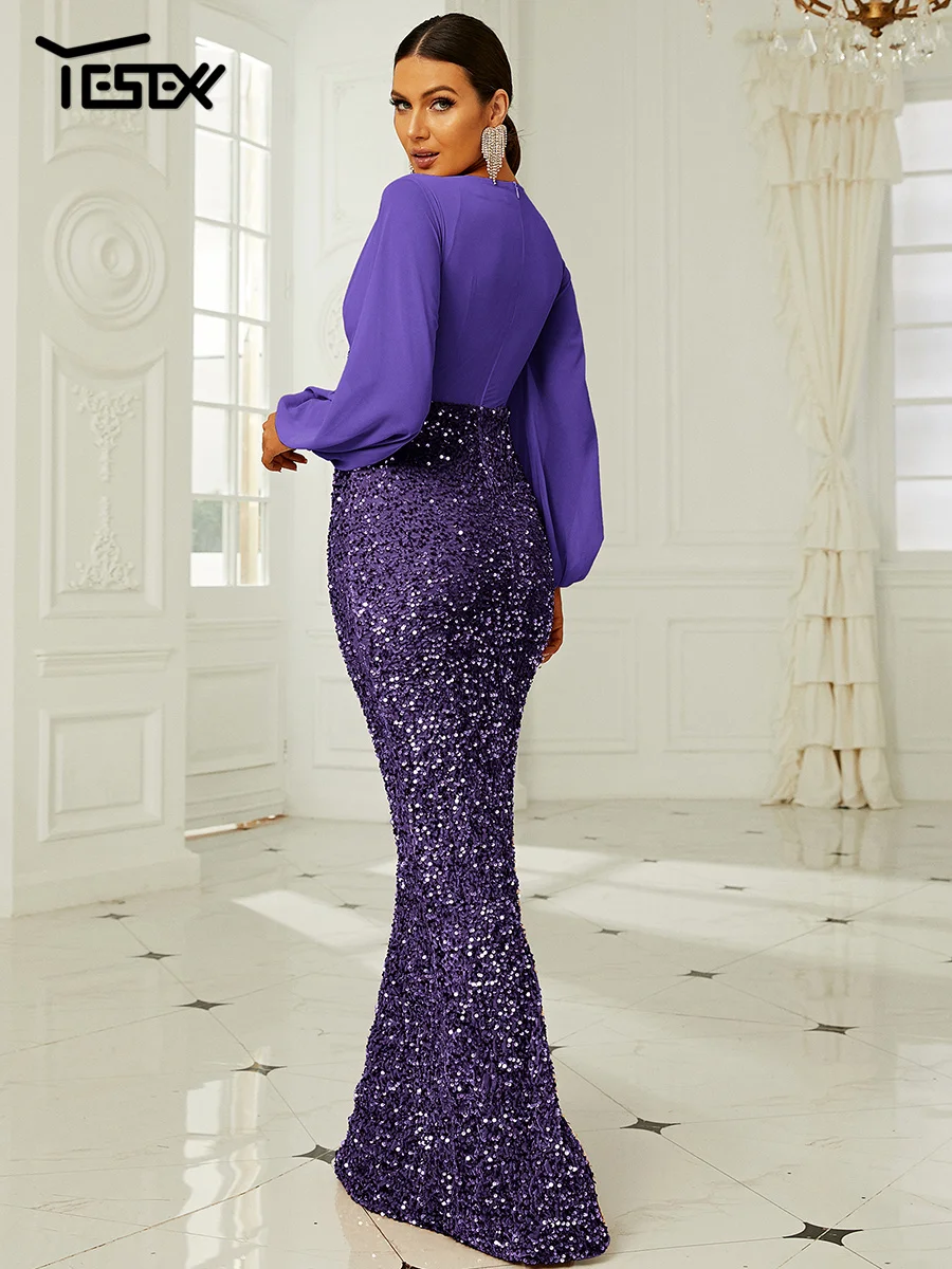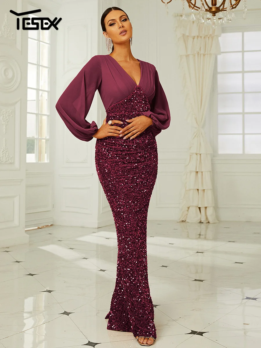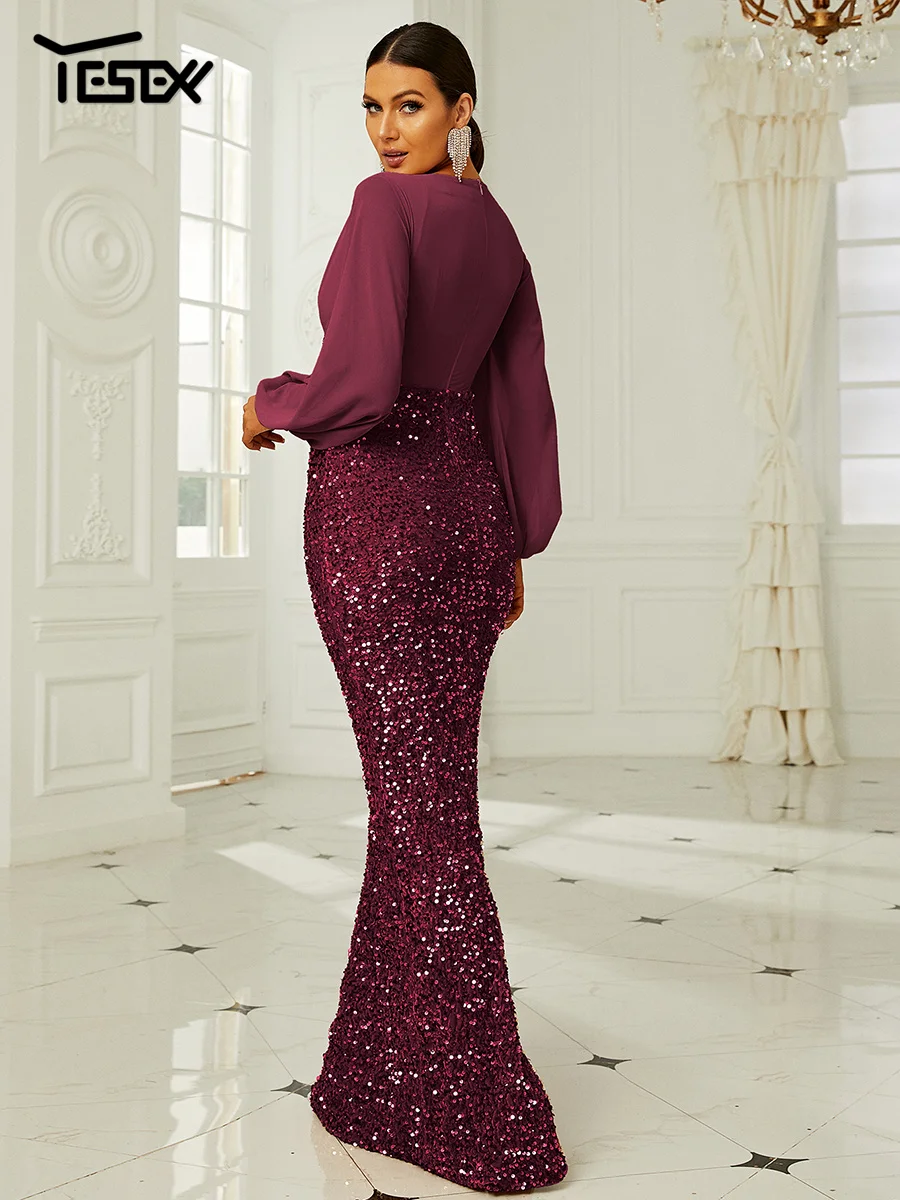فستان نسائي Yesexy فستان رسمي بحافة حورية البحر وأكمام فانوس ترتر متباين فستان سهرة أنيق أنيق فساتين رداء