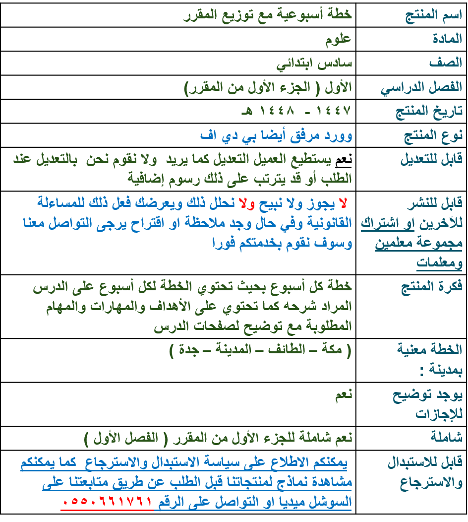 خطة أسبوعية علوم سادس ابتدائي لمدينة ( مكة - المدينة - جدة - الطائف ) الفصل الدراسي الأول
