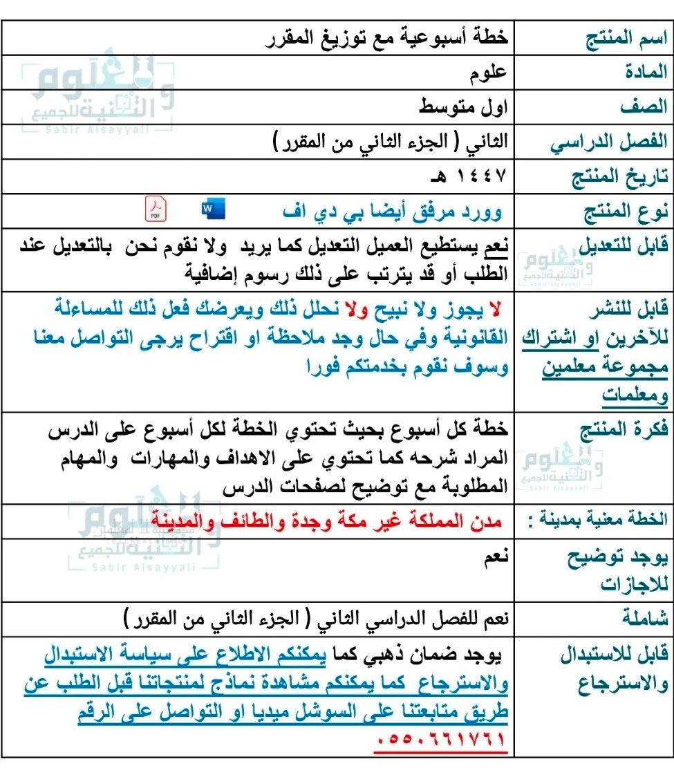 الخطة الأسبوعية الصف الأول متوسط الجزء الثاني من المقرر
