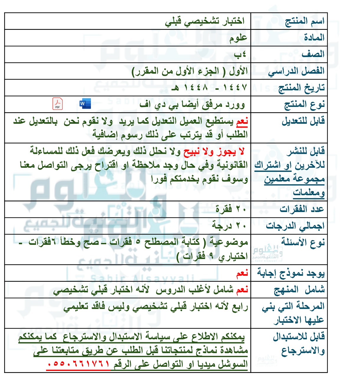 اختبار قبلي تشخيصي وورد علوم 4ب الجزء الأول من المقرر