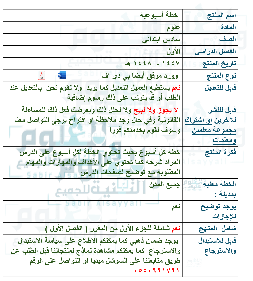 خطة أسبوعية علوم سادس ابتدائي لجميع المدن الفصل الدراسي الأول