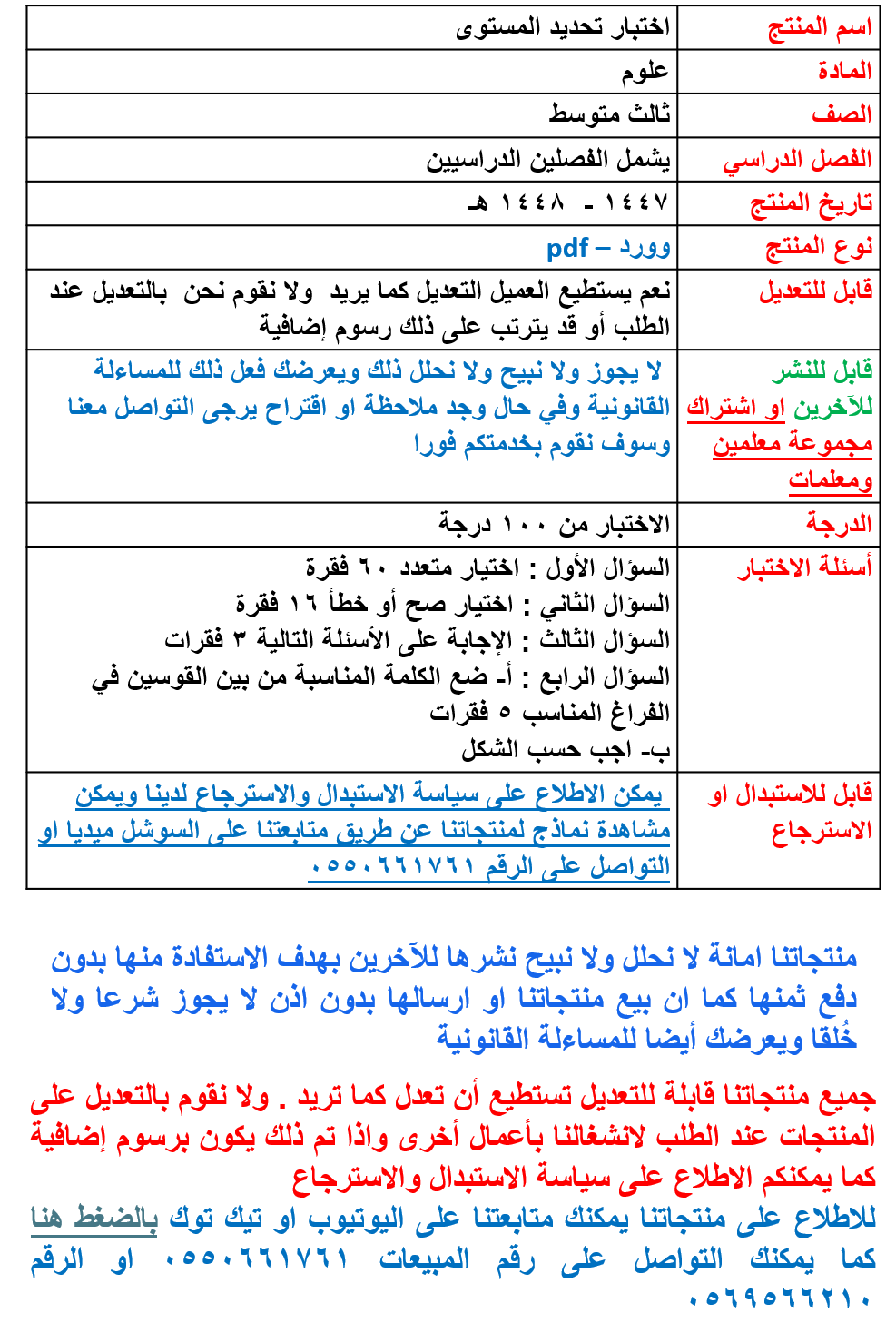 اختبار تحديد المستوى علوم ثالث متوسط شامل