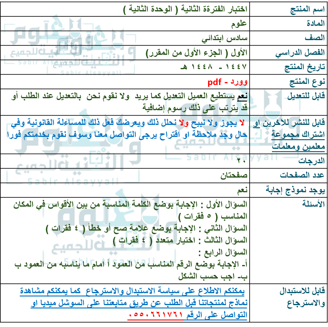 اختبار محاكي الفترة الثانية ( الوحدة الثانية ) مع نموذج إجابة علوم سادس إبتدائي الجزء الأول من المقرر