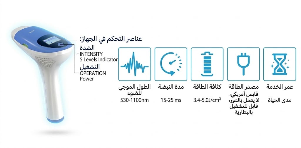 ومع إمكانية الاستخدام بحذر في المناطق الحساسة مثل خط البكيني وتحت الإبط، تبقى القاعدة: ابدئي بلطف وارفعي الشدة تدريجياً حسب تحمّل بشرتك. لكل عدسة عمر وميض طويل يصل إلى نصف مليون ومضة، ومعه 5 مستويات طاقة لتعديل الشدة تدريجياً بما يناسب لون بشرتك ودرجة التحمل والمنطقة المراد علاجها.
