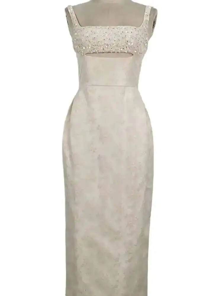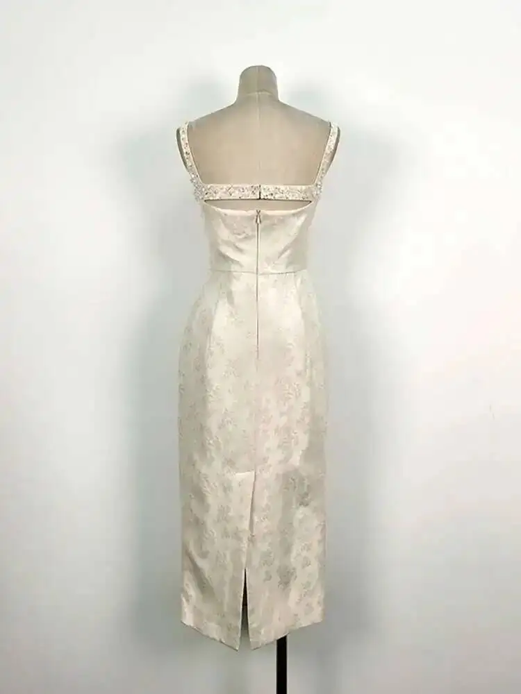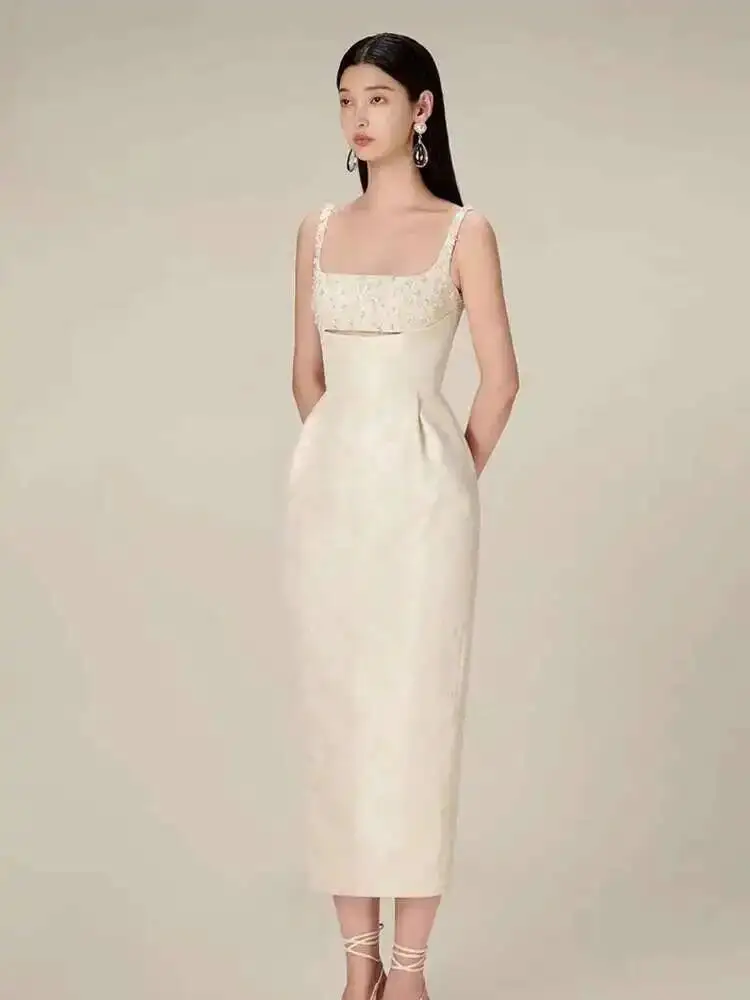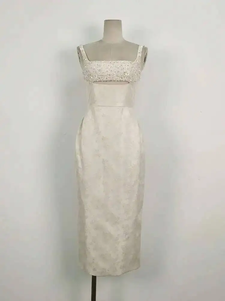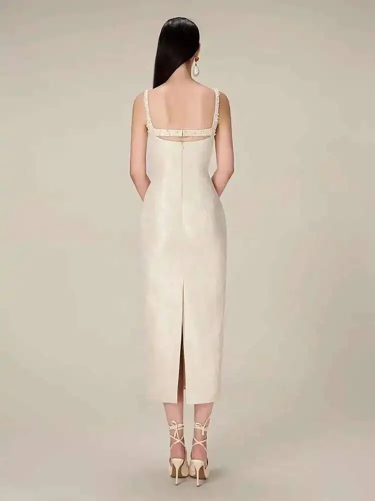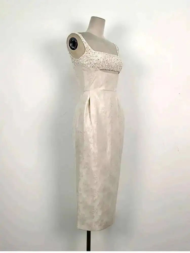 DEAT أنيقة زلة اللؤلؤ الديكور الزهور الجاكار الجوف خارج شق الاعوجاج الورك المرأة فستان أنيق 2026 ربيع جديد المد 13DB3604