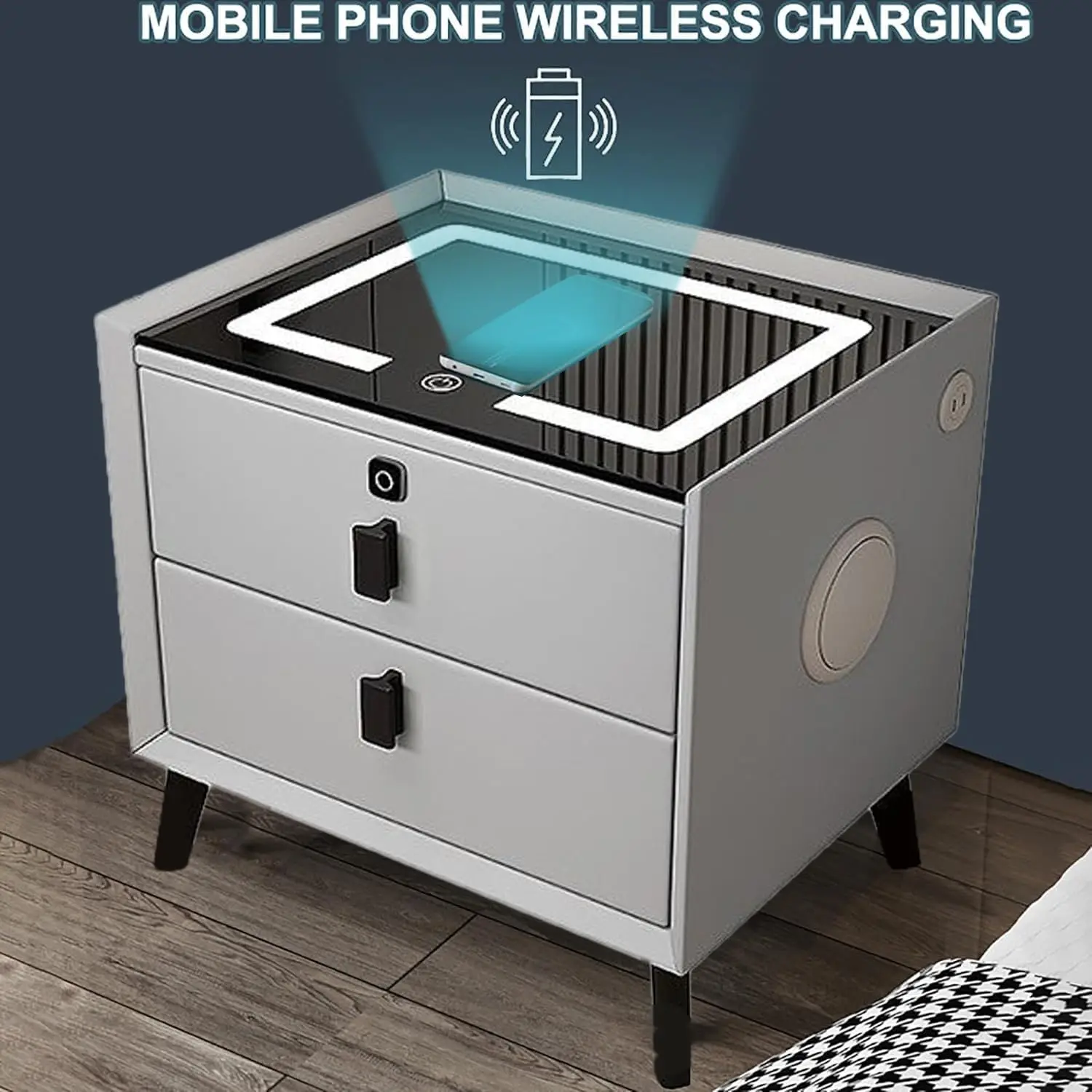 طاولة سرير ذكية خشبية، طاولة جانبية مع درج بقفل بصمة الإصبع + محطة شحن لاسلكية + منفذ USB + إضاءة LED بثلاثة ألوان + مكبر صوت