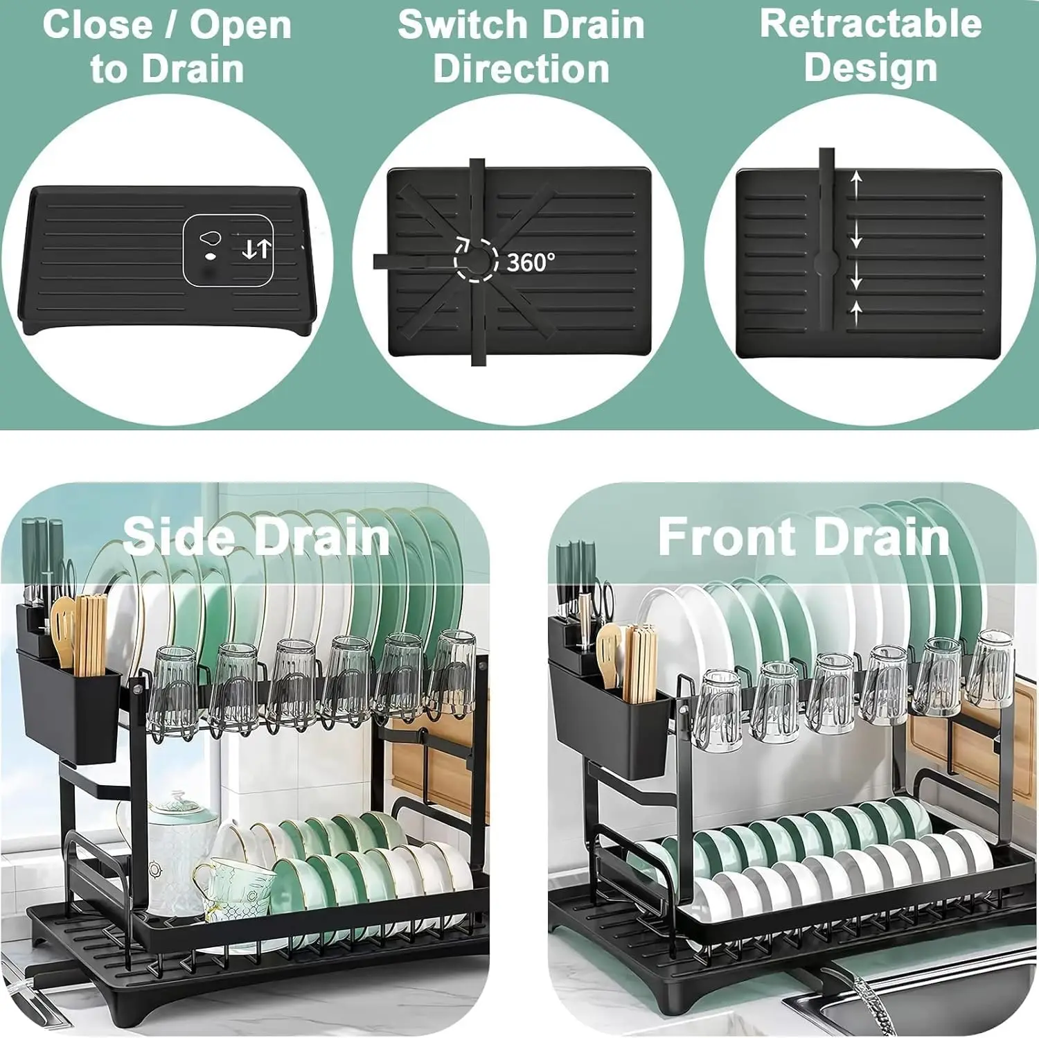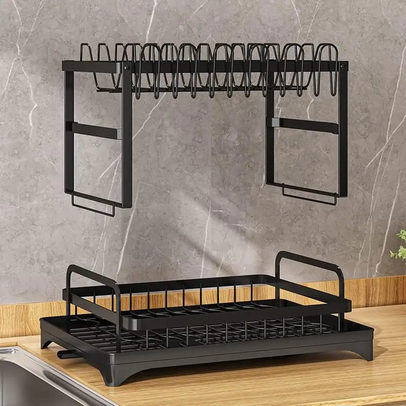 رف تجفيف الأطباق من طبقتين، يوفر مساحة مع حامل أواني، حامل لوح التقطيع، صينية لوح التصريف، تجفيف المطبخ المقاوم للصدأ