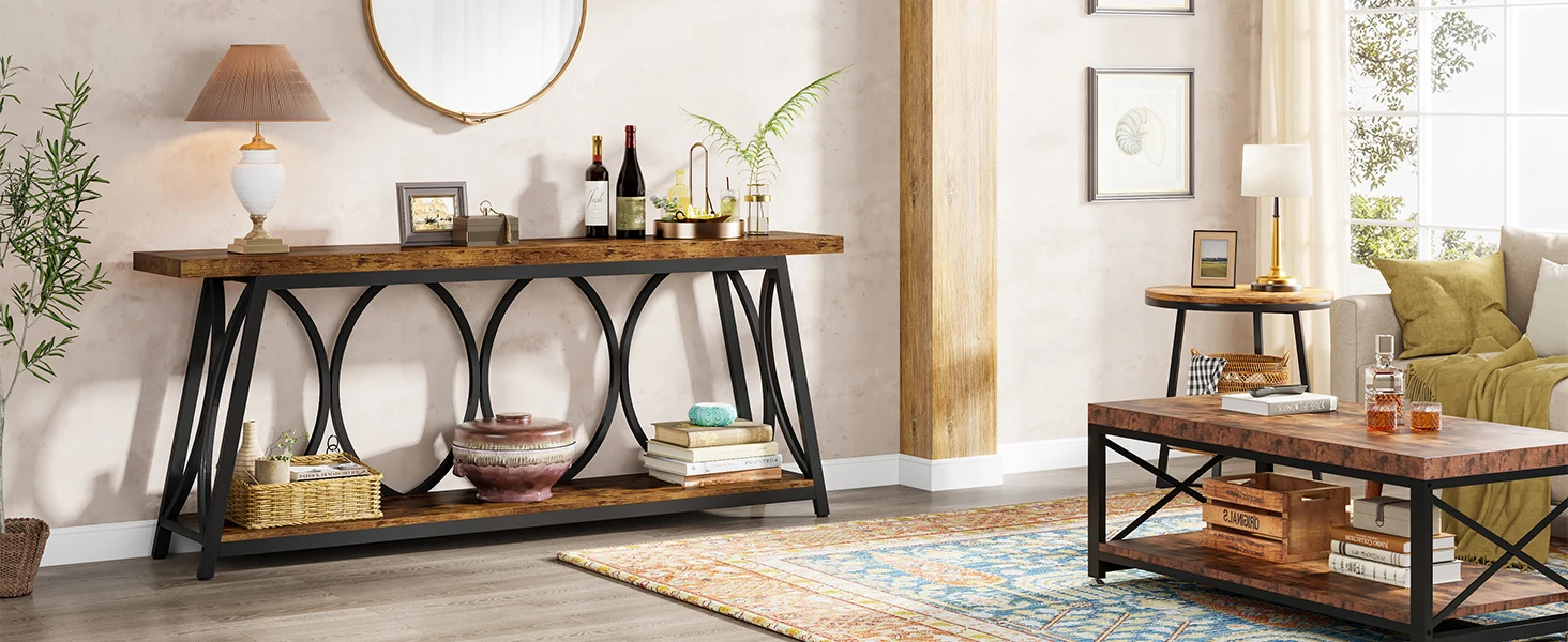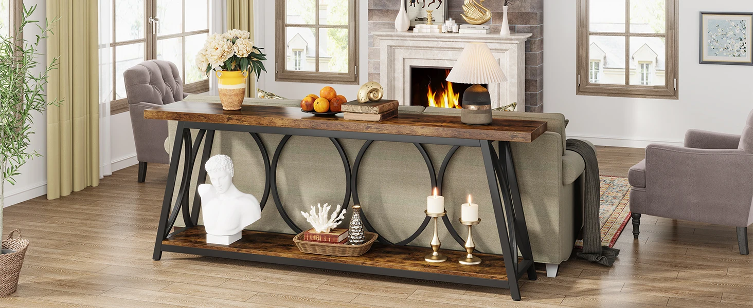 طاولة كونسول طويلة جدًا بطول 180 سم، طاولة أريكة صناعية الطراز توضع خلف الأريكة مع رف تخزين من طبقتين، طاولة زينة ضيقة للمدخل أو الممر