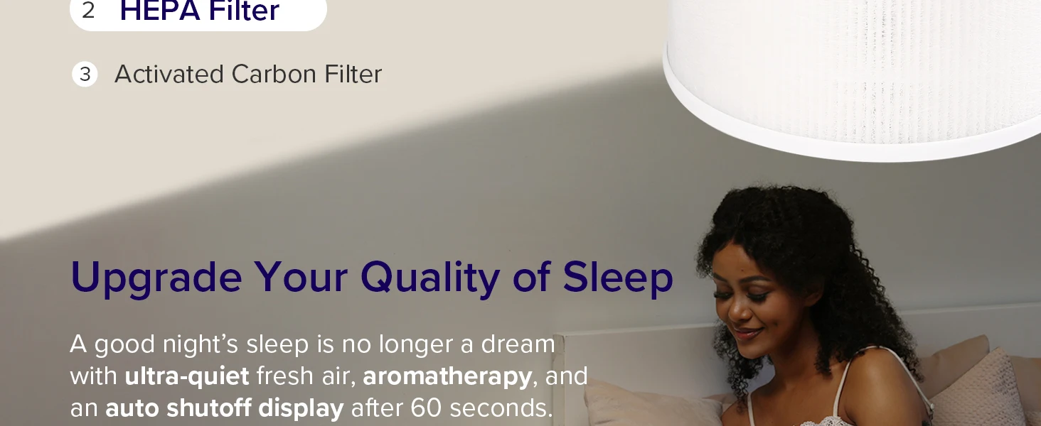 فلتر الهواء المنقي هذا المزود بتقنية QuietKEAP، تعمل المروحة بهدوء يصل إلى 27 ديسيبل، بالإضافة إلى شاشة إيقاف تلقائي، مثالية للضوء والنائمين. يقوم جهاز التنقية التلقائي بإيقاف تشغيل الشاشة ويعمل بهدوء، مما يوفر بيئة نوم خالية من الإزعاج.