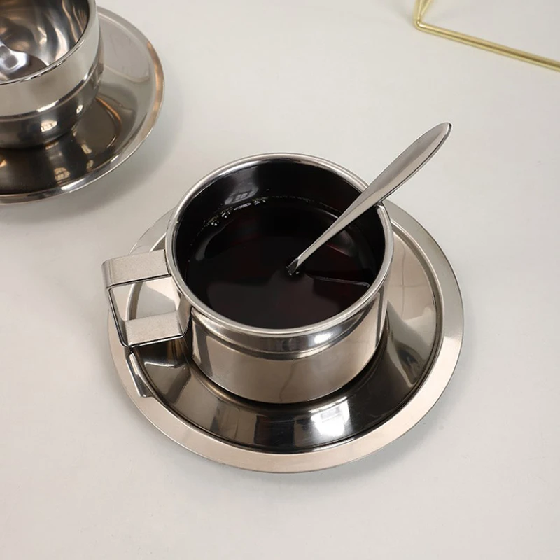 طقم فناجين قهوة من الفولاذ المقاوم للصدأ ، ذات جدران مزدوجة ، كوب مقاوم للحرارة مع ملعقة صحون ، أدوات طعام للمشروبات ، إكسسوارات مقاهي المطبخ ، 3 صحن