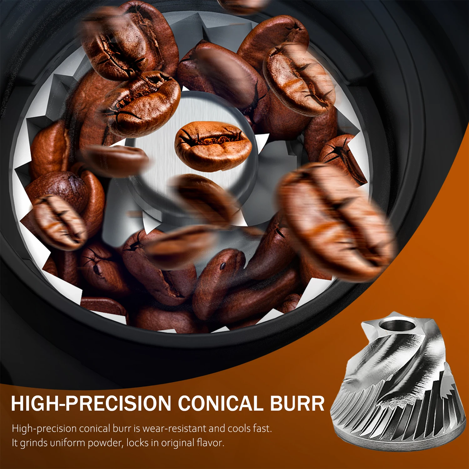 صُممت الشفرات المخروطية الدقيقة المصنوعة من الفولاذ المقاوم للصدأ بعناية، وبفضل التصميم الخالي من البقايا، تكون كل عملية طحن دقيقة تمامًا دون أي هدر أو بقايا تفسد كوبك القادم. ستستمتع بكل نكهة لحبوب القهوة الخاصة بك، كوبًا بعد كوب.
