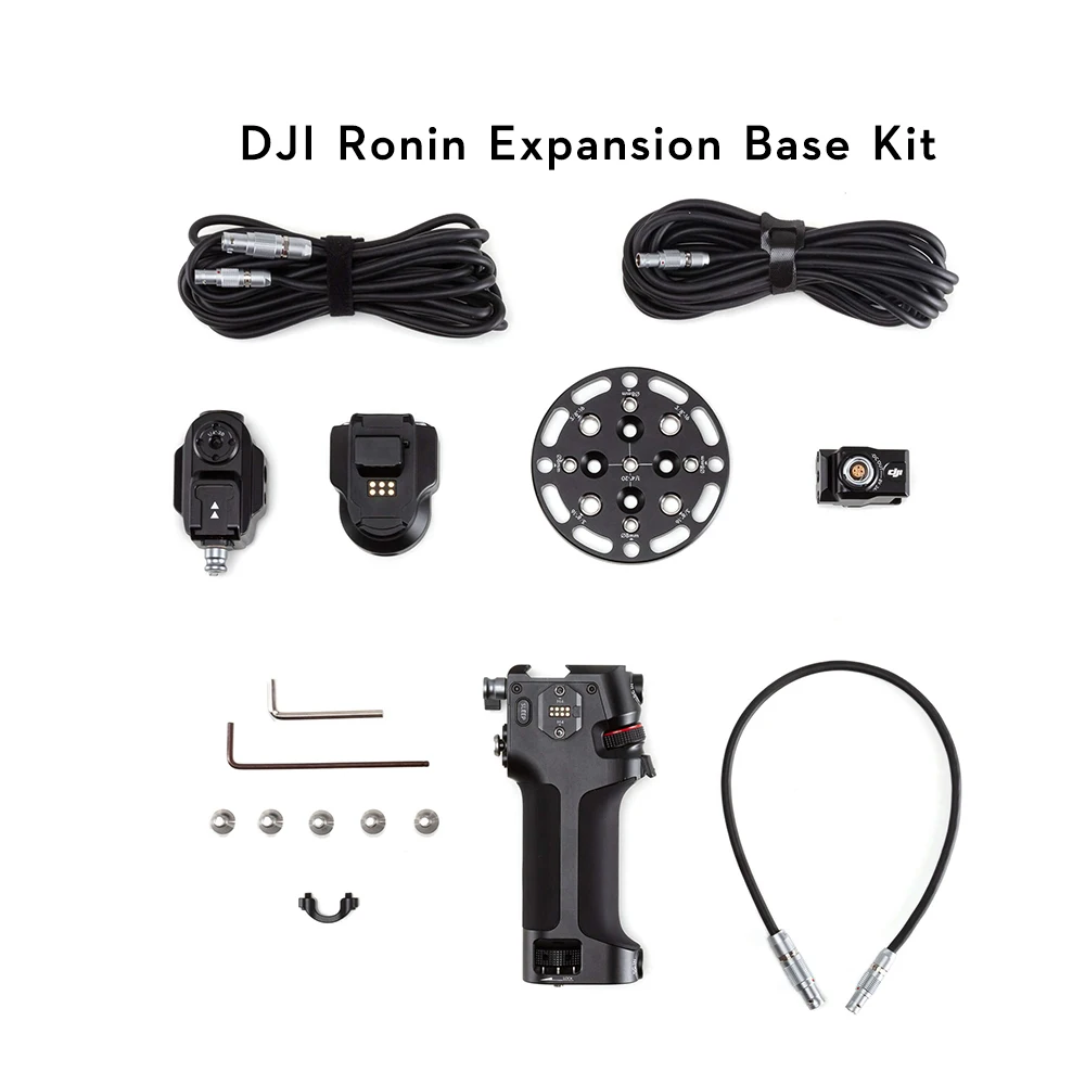 The DJI Ronin Expansion Base Kit makes it possible to mount and control DJI RS 2 in a jib, car, slider, cable cam, and other platforms. This kit includes a DJI Ronin Tethered Control Handle for extended wired control of camera focus and parameters, camera shutter, and gimbal movement. A Universal Base Mount and External Battery Adapter allow the DJI Ronin BG30 Grip to power DJI RS 2.