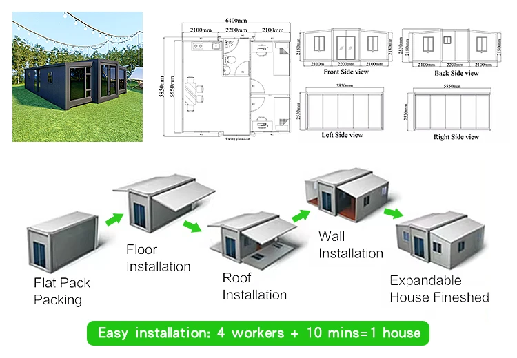 منزل مسبق الصنع قابل للتوسيع قابل للطي من الفولاذ ، فيلا قابلة للتوسيع ، غرفتي نوم 5 ، 40 قدمًا ، 20 قدمًا للشحن