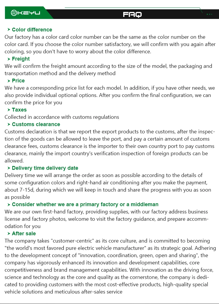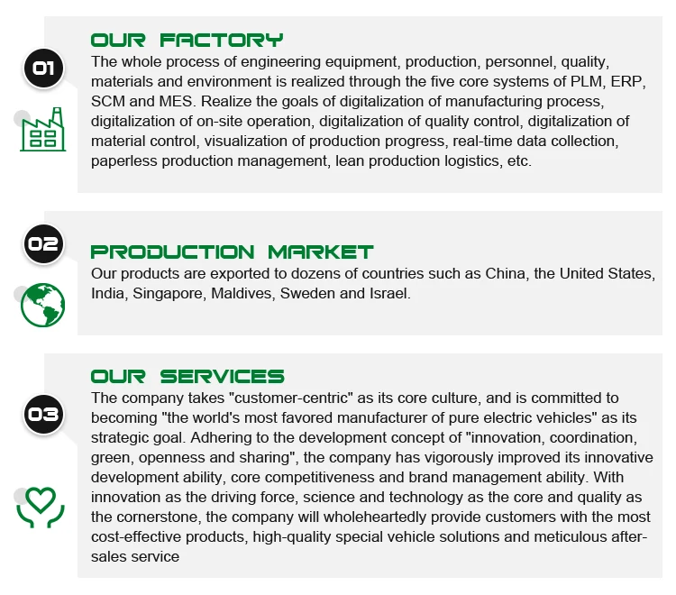 تلتزم الشركة بالهدف الاستراتيجي المتمثل في أن تصبح "شركة عالمية مصنعة للسيارات الكهربائية النقية عالية الجودة" وثقافة الشركة الأساسية "الموجهة نحو العملاء". التمسك بمفهوم تطوير "الابتكار والتنسيق والأخضر والانفتاح والمشاركة" ، سنعزز بقوة قدرة الشركة على الابتكار والتطوير والقدرة التنافسية الأساسية وإدارة العلامة التجارية. الالتزام بالابتكار كقوة دافعة ، والتكنولوجيا باعتبارها النواة ، والجودة باعتبارها حجر الزاوية ، وتزويد العملاء بكل إخلاص بالمنتجات الأكثر فعالية من حيث التكلفة ، حلول مركبات خاصة عالية الجودة وخدمة ما بعد البيع الدقيقة.