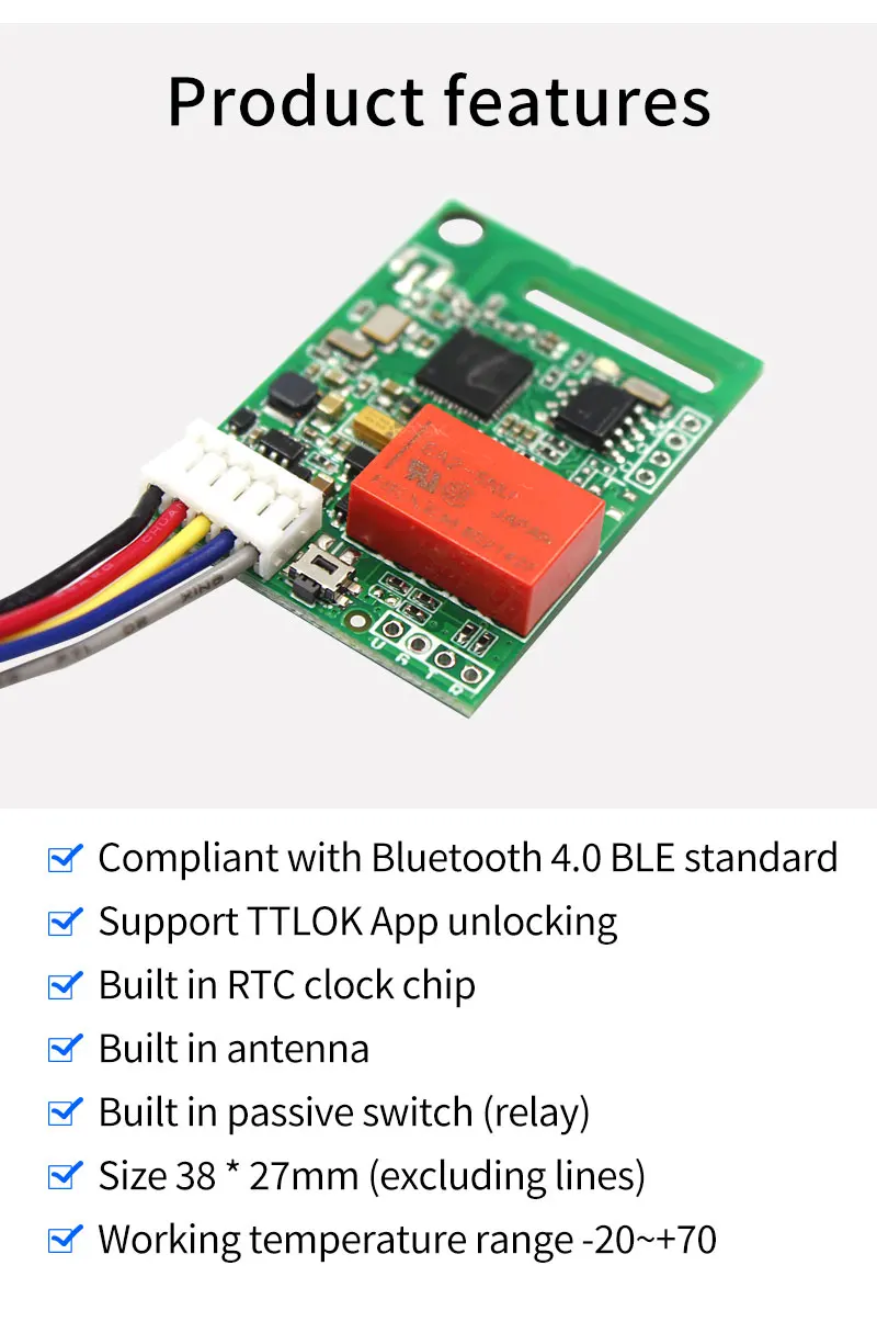توفر طريقة فعالة من حيث التكلفة لإضافة تحكم مريح عبر تطبيق الهاتف الذكي (عبر البلوتوث وتطبيق TTLOCK) إلى أقفال الأبواب الكهربائية الحالية أو فتاحات البوابات أو لوحات التحكم في الوصول، مما قد يلغي الحاجة إلى المفاتيح المادية في العديد من السيناريوهات. توفر إمكانات فتح عن بعد مباشرة من هاتفك ضمن نطاق البلوتوث. يسمح الريلاي المدمج (NO/NC/COM) بالتوافق مع آليات القفل الكهربائية المختلفة. يمكن لساعة الوقت الفعلي المدمجة والتوافق مع منصة TTLOCK تمكين ميزات متقدمة مثل جدولة الوصول وإدارة المستخدمين وسجلات النشاط (اعتمادًا على وظائف التطبيق المحددة والإعداد). تصميمها منخفض الطاقة يجعلها مناسبة للتكامل في الأنظمة المدعومة بالبطاريات.