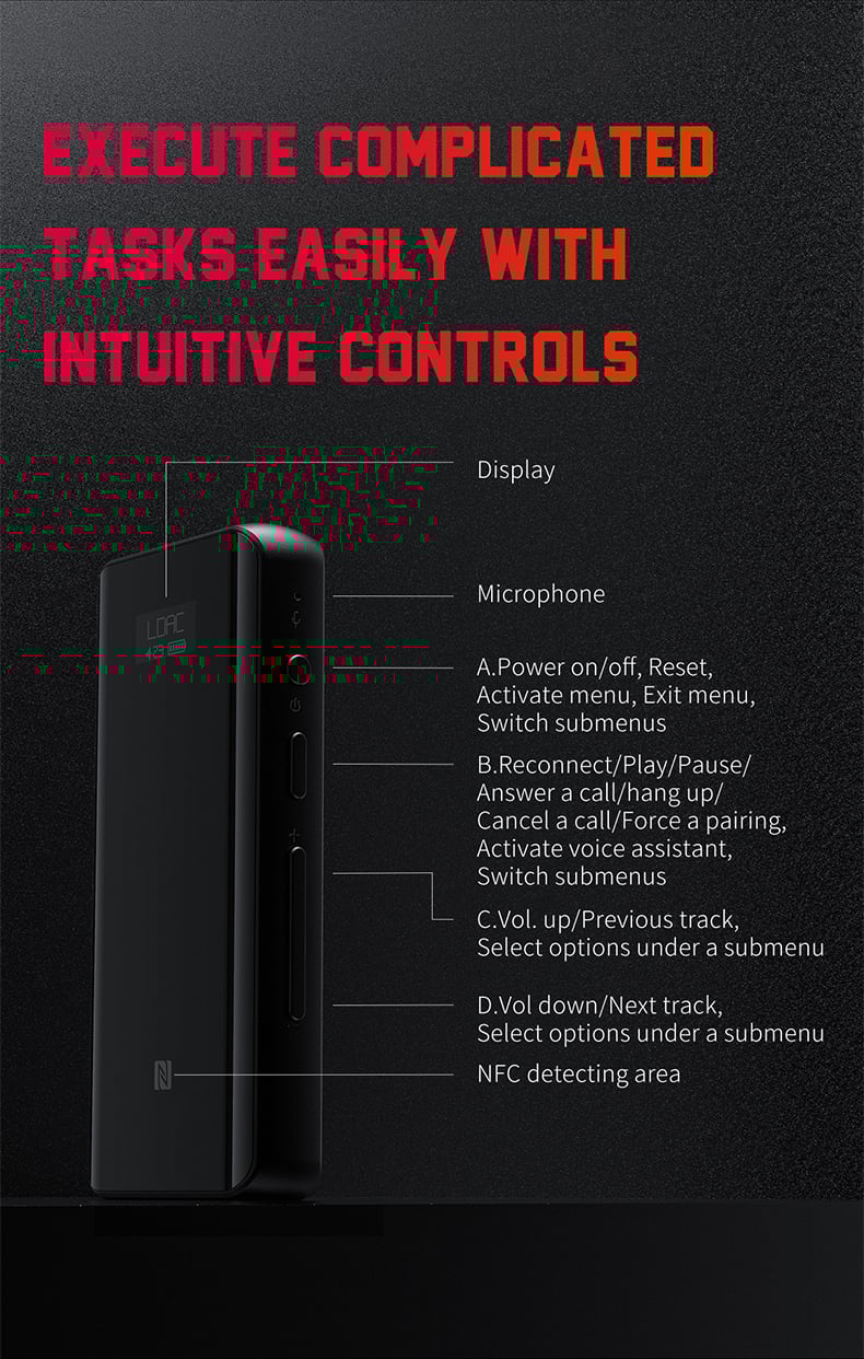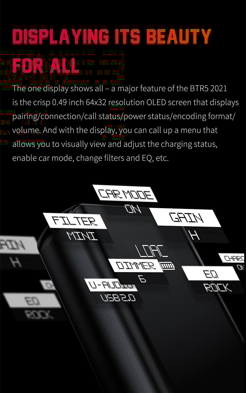 لتحقيق أقصى استفادة من السماعات عالية الجودة، يتميز BTR5 2021 بمنفذ 2.5mm Balanced الذي يوفر طاقة أكبر وصوتًا أنقى، إلى جانب منفذ 3.5mm Single Ended للتوافق مع معظم السماعات. كما أن الشاشة OLED بحجم 0.5 بوصة تمنحك عرضًا واضحًا لكل المعلومات، بدءًا من وضع الاتصال ومستوى الصوت، وحتى تفاصيل البطارية ووضعية السيارة.