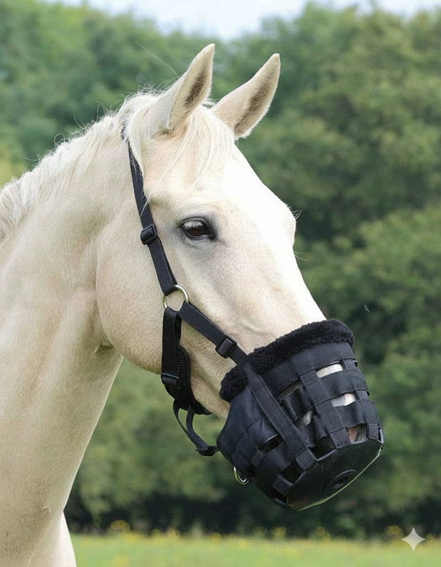 كمامة رعي للخيول مع لجام لتسهيل تنفسها وراحتها، ومساعدتها على إنقاص وزنها ومنعها من الأكل بشكل عشوائي، مع حواف مخملية للمزيد من الراحة | عدة مقاسات