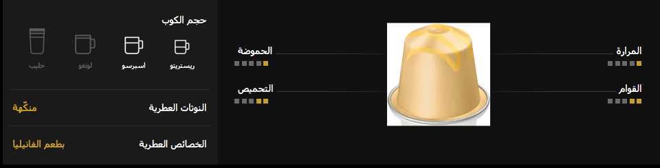 بانسجام حلو تمتزج إبداعات الباريستا فانيلا إكلير بتناغم عذب لتعطينا اسبريسو متكاملة وسلسة من الأرابيكا القادمة من أمريكا اللاتينية. تُعرف الخلطة الأساس من أصناف الأرابيكا البرازيلية والكولومبية بنكهتها العذبة ونوتات الحبوب المخمرة لتعطي توليفة من روائح القهوة المحمصة الكلاسيكية. تتمتع إبداعات الباريستا فانيلا إكلير من نسبريسو بتوليفة مليئة وغنية وتضفي نكهة الفانيلا طبقة مخملية لباقة النكهات. إذا كنت من محبي الانغماس في توليفة من النكهات والروائح الشهية، جربها كفنجان كابوتشينو وتذوق نوتات اللوز المتجانسة مع نكهة الكاسترد الكريمية.