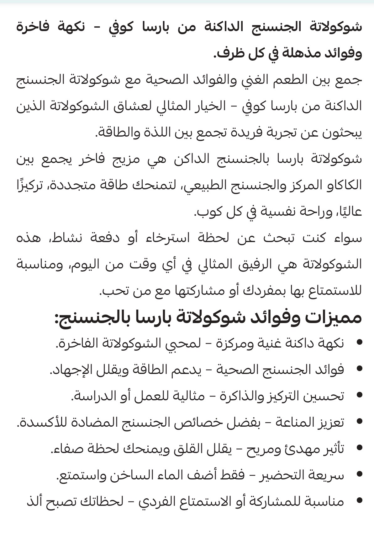 باريسي كوفي شوكلاتة داكنة مع الجنسنج بدون سكر ٥ اكياس تواصل قبل الطلب