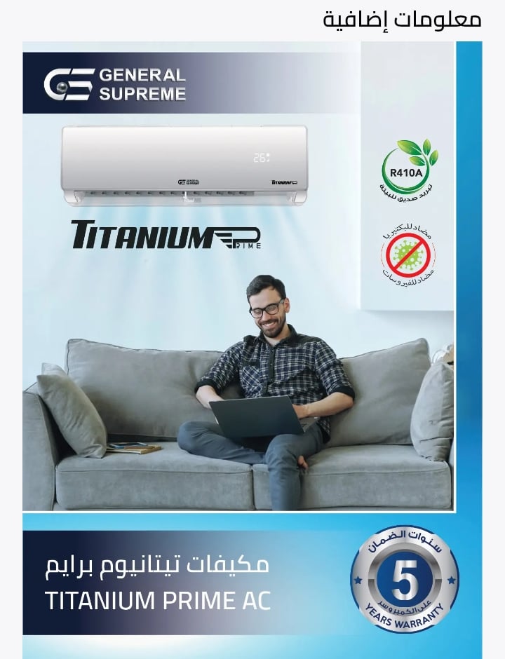- GSTN180CR جنرال سوبريم مكيف هواء سبليت تيتانيوم برايم, سعة تبريد حقيقية 18,000 وحدة ريش ذهبية, تحكم واي فاي,خاصية الأستشعار, توزيع الهواء في اربع اتجاهات.GSTN180CR General Supreme Titanium Prime Split Air Conditioner, 18,000 BTU Actual Cooling Capacity,