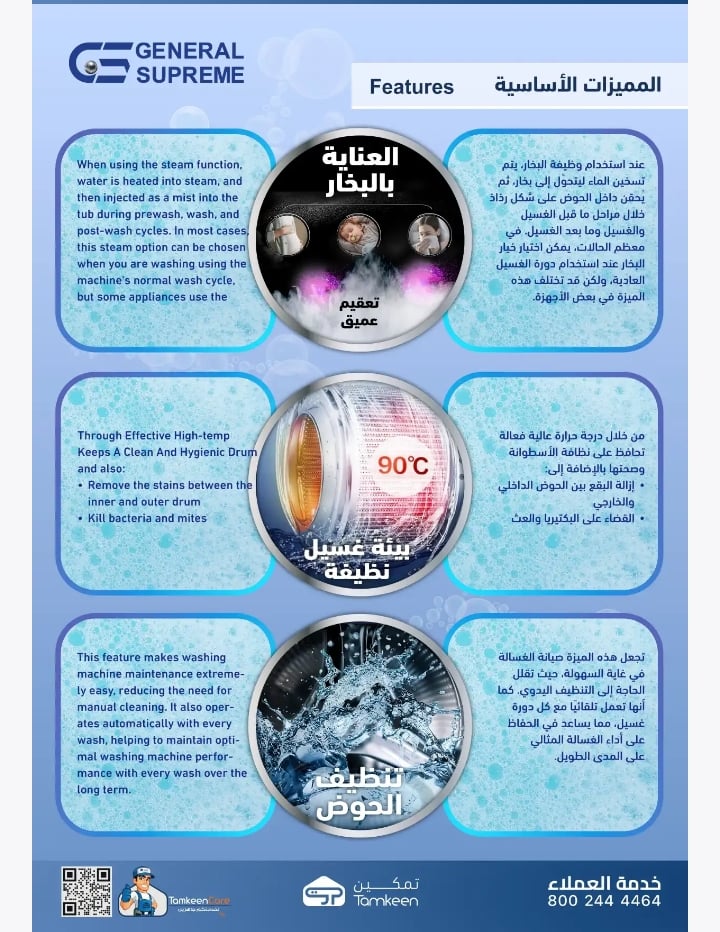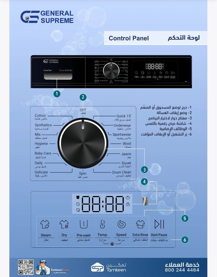 - GSFLK1006DH جنرال سوبريم غسالة تعبئة أمامية 10 كيلو غسيل/ 6 كيلو تجفيف –15 برنامج، انفيرتر، فضي داكن. GSFLK1006DHGSFLK1006DH General Supreme Front Load Washing Machine, 10 kg Wash/6 kg Dry – 15 Programs, Inverter, Dark Silver. GSFLK1006DH