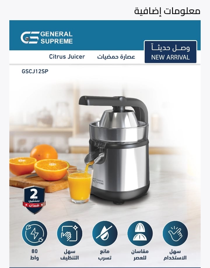 - GSCJ12SP GSCJ12SP ,جنرال سوبريم عصارة حمضيات , بقدرة 80 واط، ستانلسGSCJ12SP General Supreme Citrus Juicer, 80W, Stainless Steel