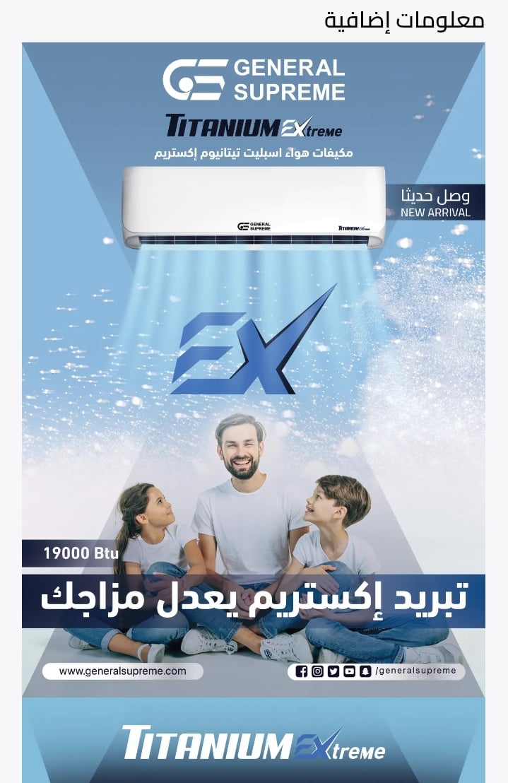 GSTN190CX جنرال سوبريم مكيف هواء سبليت تيتانيوم اكستريم, سعة تبريد 19,000 وحدة, ريش ذهبية, تحكم واي فاي, منبه تنظيف الفلتر, خاصية الأستشعار.GSTN190CX General Supreme Titanium Extreme Split Air Conditioner, 19,000 BTU cooling capacity, gold fins, Wi-Fi co