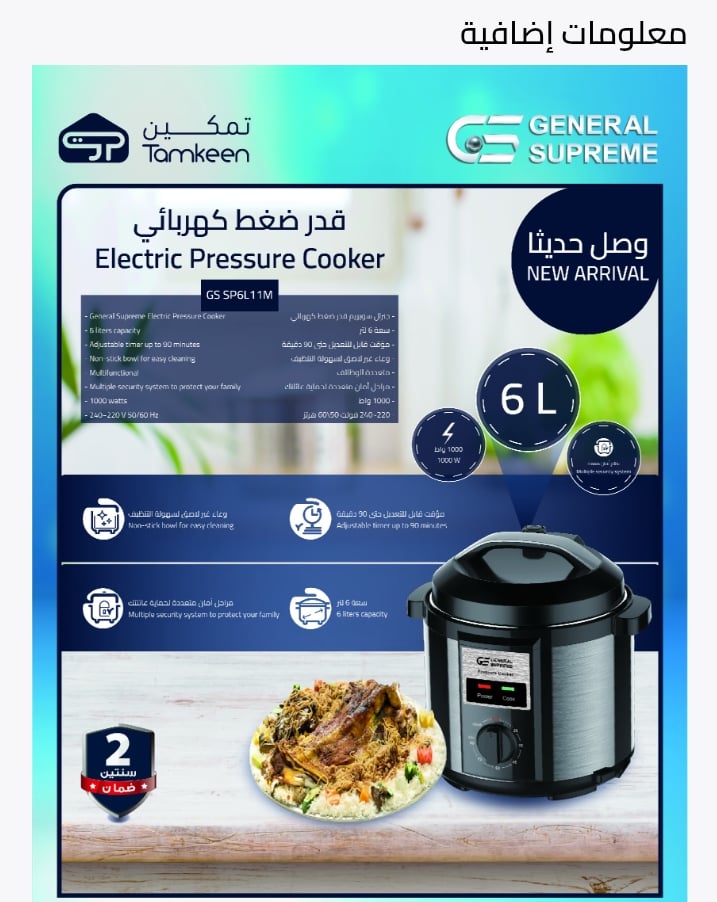 - GSSP6L11M جنرال سوبريم قدر ضغط كهربائي سعة 6 لتر، قدرة 1000 واط, GSSP6L11MGSSP6L11M General Supreme 6L Electric Pressure Cooker, 1000W, GSSP6L11M