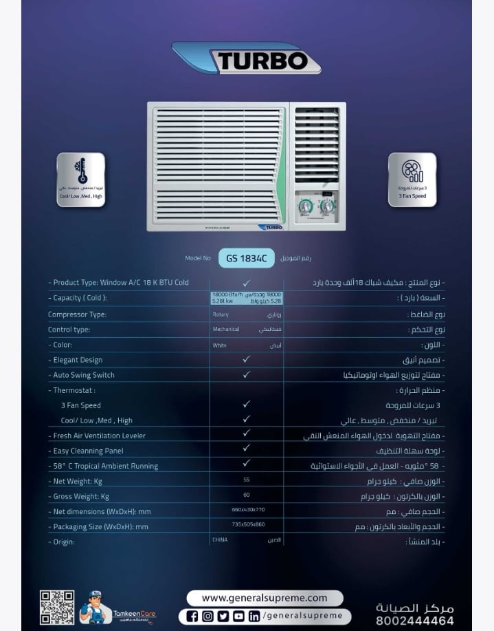 - GS1834C جنرال سوبريم مكيف شباك تيربو، بسعة 18000 وحدة، بارد، روتاري , GS1834CGS1834C General Supreme Turbo Window Air Conditioner, 18000 BTU, Cooling Only, Rotary, GS1834C