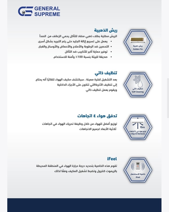 - GSINV24C جنرال سوبريم مكيف هواء سبليت دايموند بلو, سعة تبريد حقيقية 22,000 وحدة, ريش ذهبية, تنظيف ذاتي, خاصية الاستشعار, توزيع الهواء في أربع اتجاهات. انفيرترGSINV24C General Supreme Diamond Blue Split Air Conditioner, 22,000 BTU Actual Cooling Capacity,