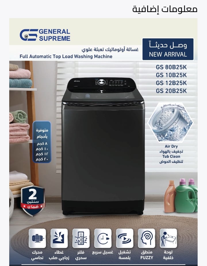 - GS80B25K جنرال سوبريم غسالة اوتوماتيك تعبئه علوية 8 كيلو، 10 برنامج , فضي غامق,GS80B25K