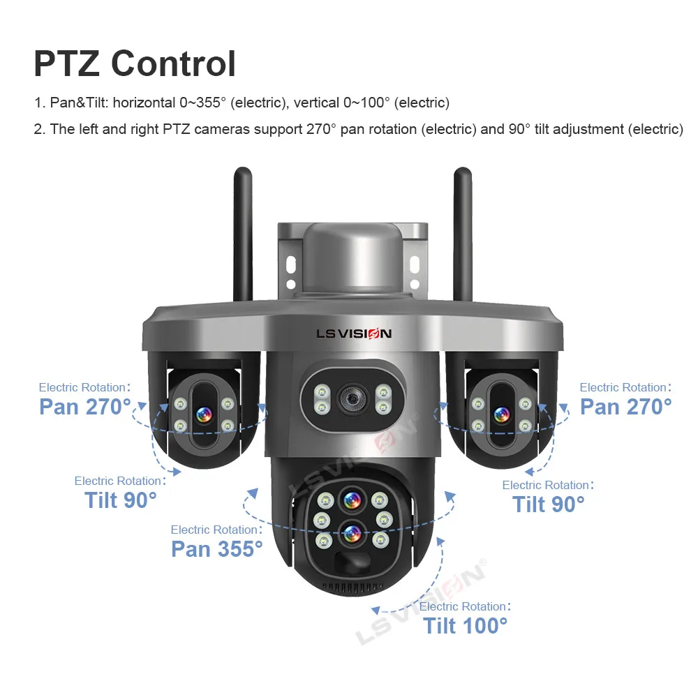 تدعم كاميرات PTZ اليسرى واليمنى 270° دوران عموم (كهربائي) و 90° تعديل الميل (كهربائي)