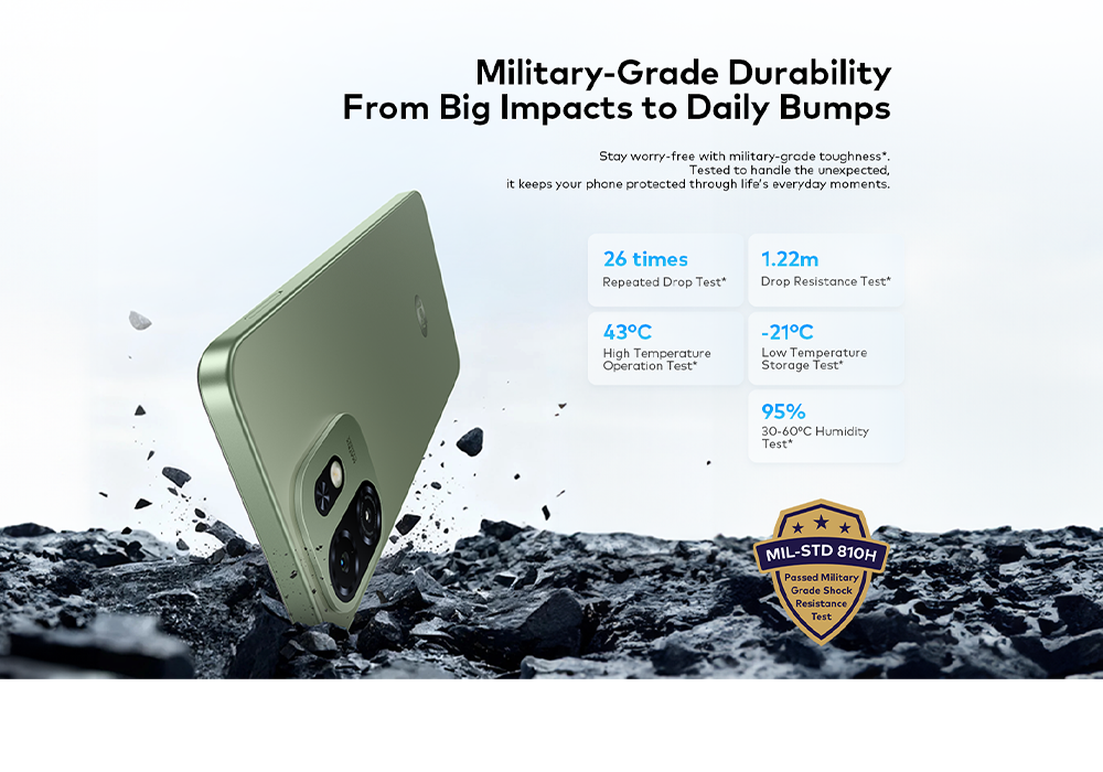 التفاصيل الشاشة شاشة IPS LCD بحجم 6.6 بوصة ودقة FHD+ (1570x720) ومعدل تحديث 90 هرتز. المعالج معالج ثماني النواة من نوع Unisoc T7100.الذاكرة العشوائية (RAM)3 جيجابايت، قابلة للتوسيع افتراضياً (RAM افتراضية) لتصل إلى 8 جيجابايت إجمالاً (3+5 جيجابايت أو 4+4 جيجابايت حسب الإصدار).التخزين الداخلي128 جيجابايت، قابلة للتوسيع عبر بطاقة microSD حتى 1 تيرابايت. الكاميرا الخلفية إعداد كاميرا ثلاثية (لكن مستشعر رئيسي واحد فعال) بدقة 8 ميجا بكسل. الكاميرا الأمامية بدقة 5 ميجا بكسل. البطارية سعة كبيرة تبلغ 5000 مللي أمبير في الساعة مع دعم الشحن عبر منفذ Type-C.نظام التشغيل يعمل بنظام Android 14 (نسخة Go).ميزات إضافية مستشعر بصمة إصبع جانبي، ميزة فتح القفل بالوجه، دعم شبكات الجيل الرابع 4G، إمكانية التحكم بالأجهزة المنزلية عبر الأشعة تحت الحمراء (IR Blaster).