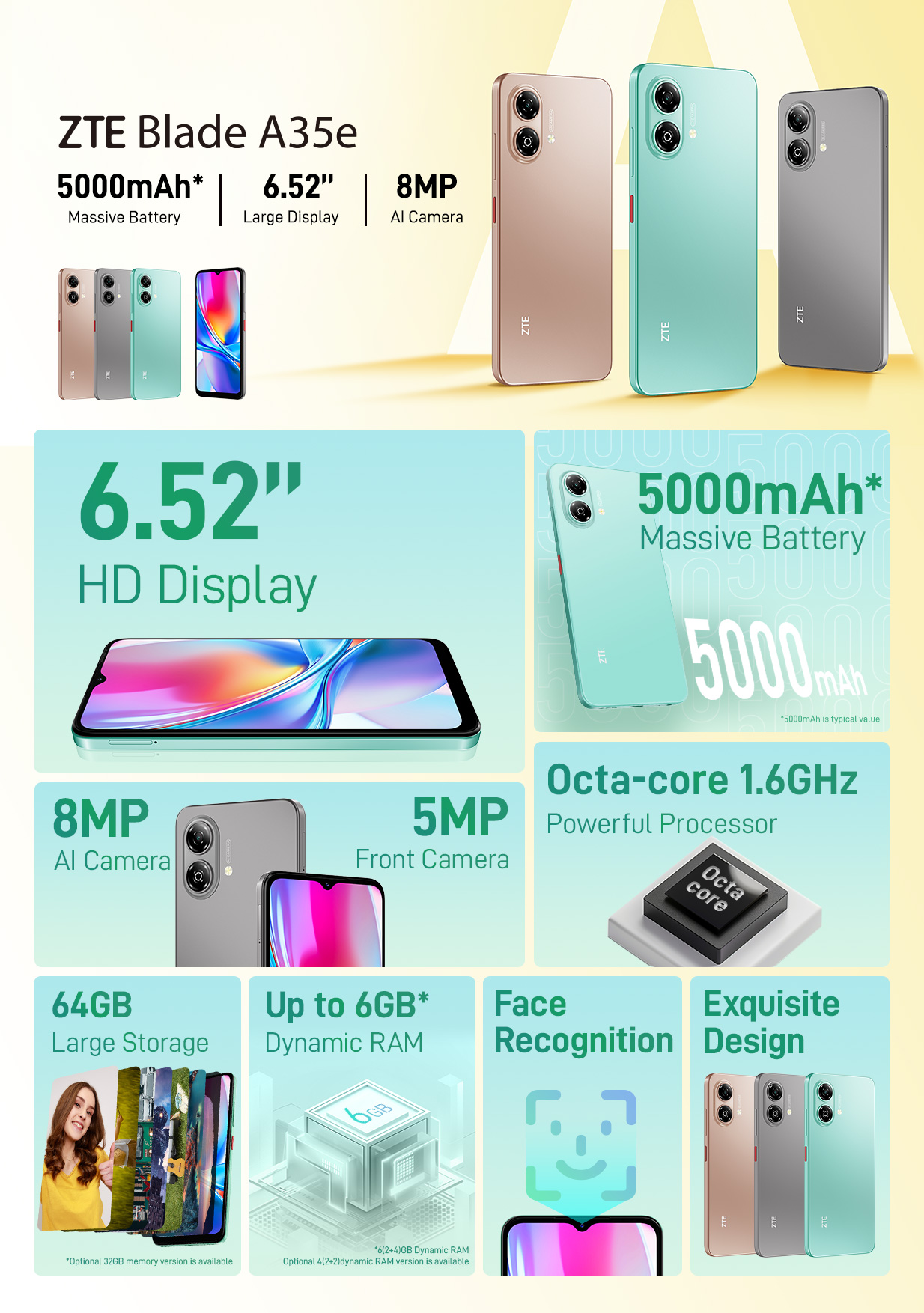 جوال ZTE Blade A35e ذاكرة 64/6 جيجا - ذاكرة رام موسعه (4+2) ,قياس الشاشة 6.52 إنش