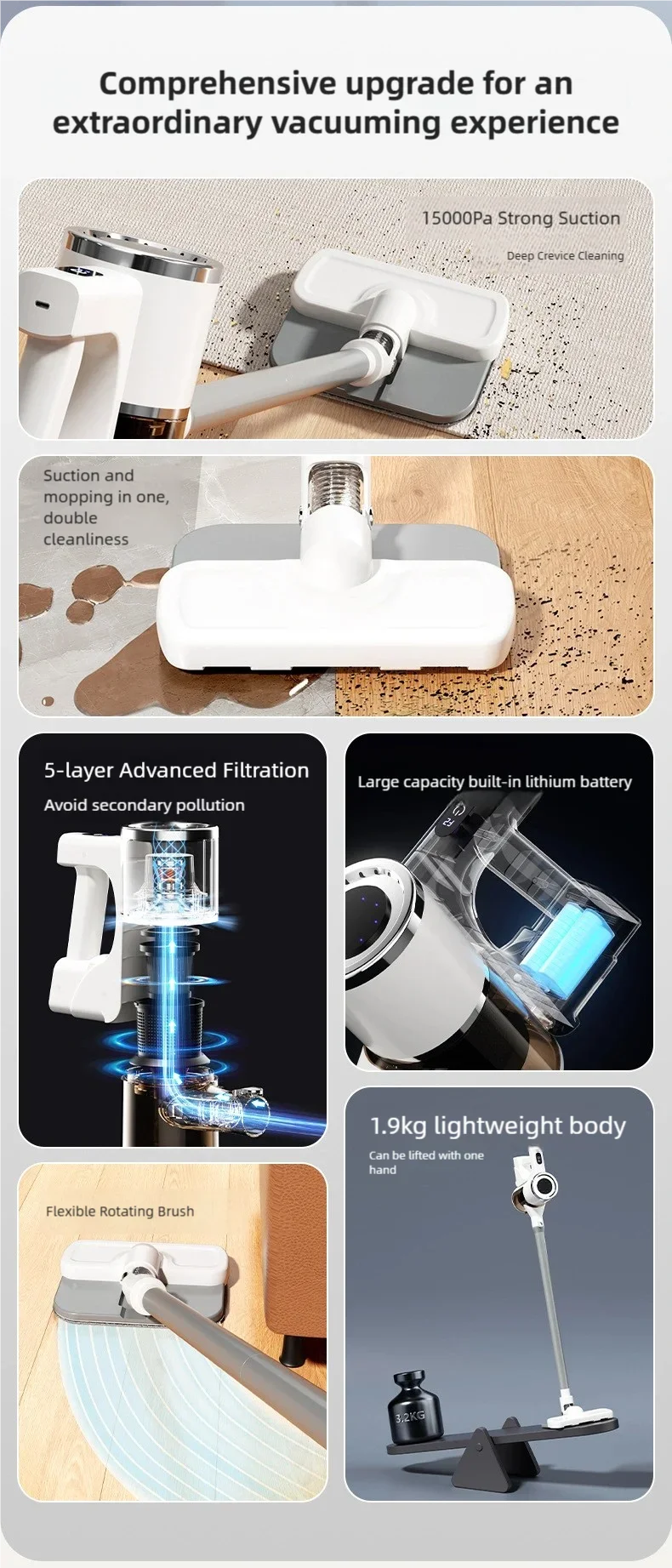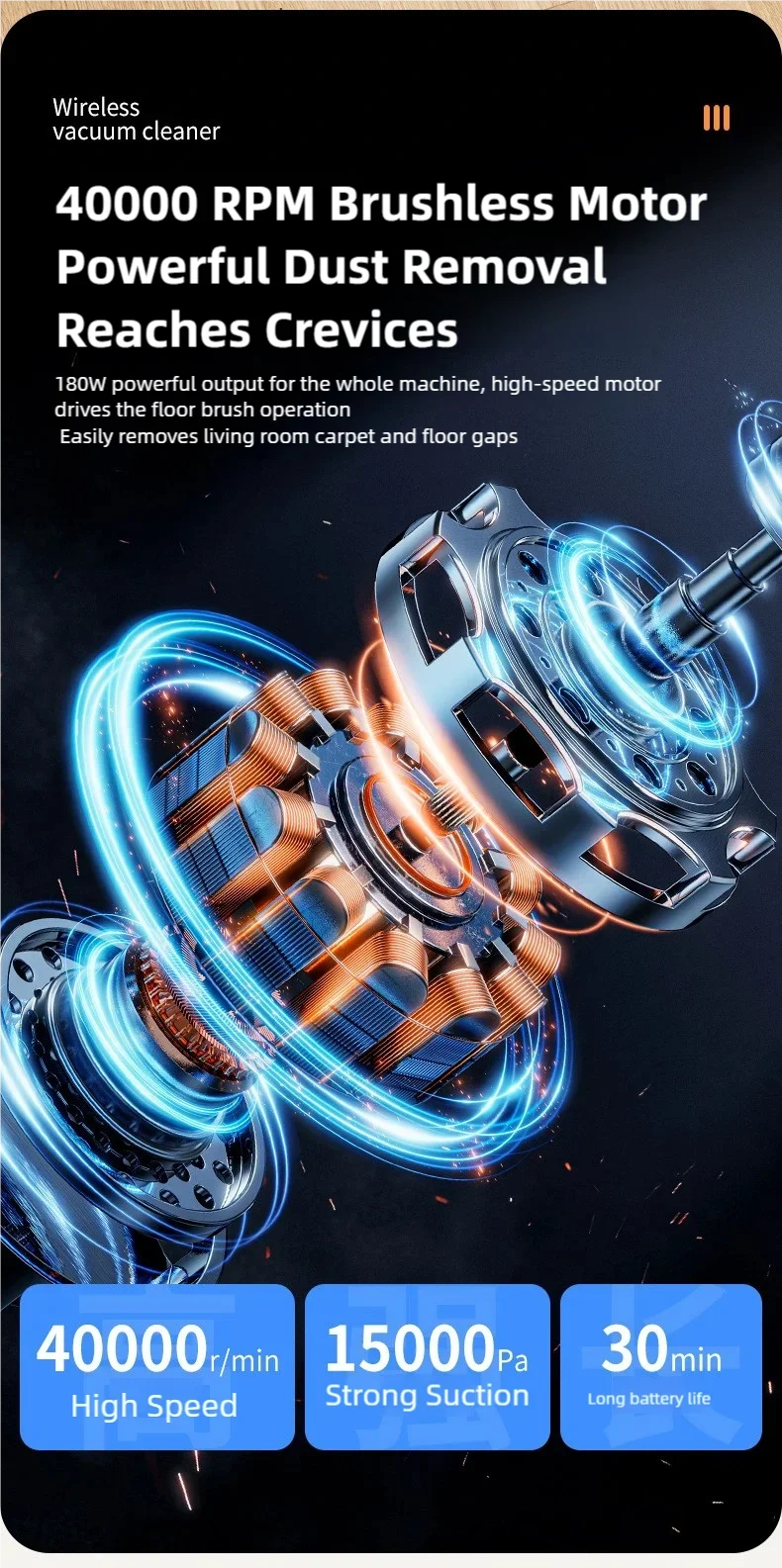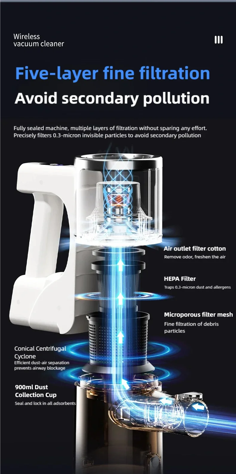 TINSOL 15000PA مكنسة كهربائية لاسلكية مكنسة لاسلكية محمولة 900 مللي كوب غبار مكنسة قابلة للفصل للأرضيات الصلبة/السجاد/شعر الحيوانات الأليفة