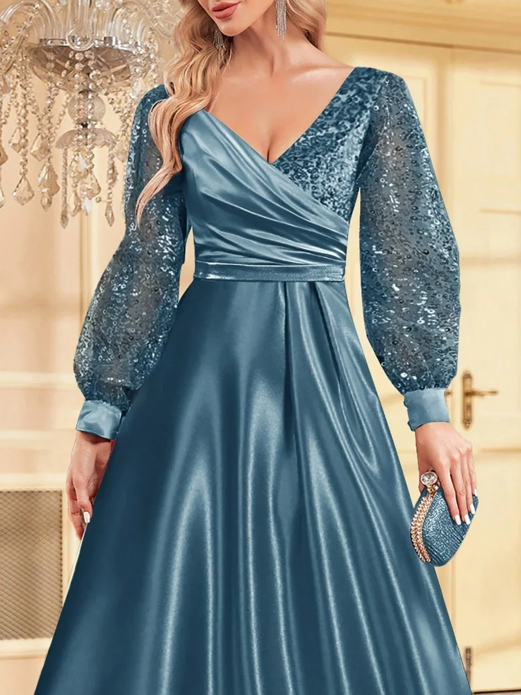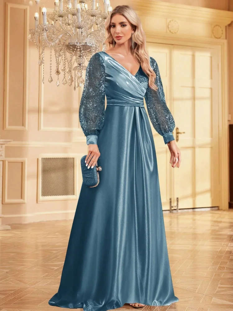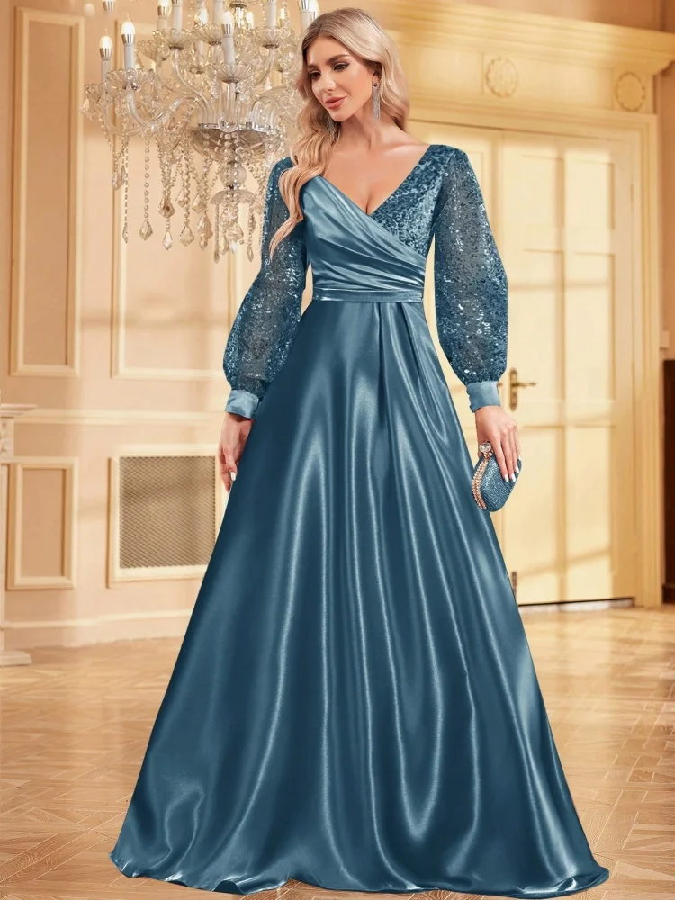 فستان سهرة فاخر أزرق على شكل حرف v ترتر 2025 فستان ماكسي أنيق للنساء للحفلات بأكمام طويلة فستان كوكتيل للحفلات الراقصة فساتين التخرج