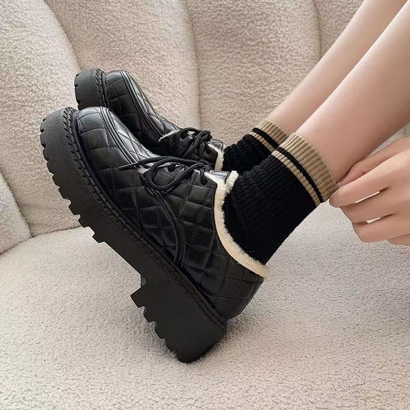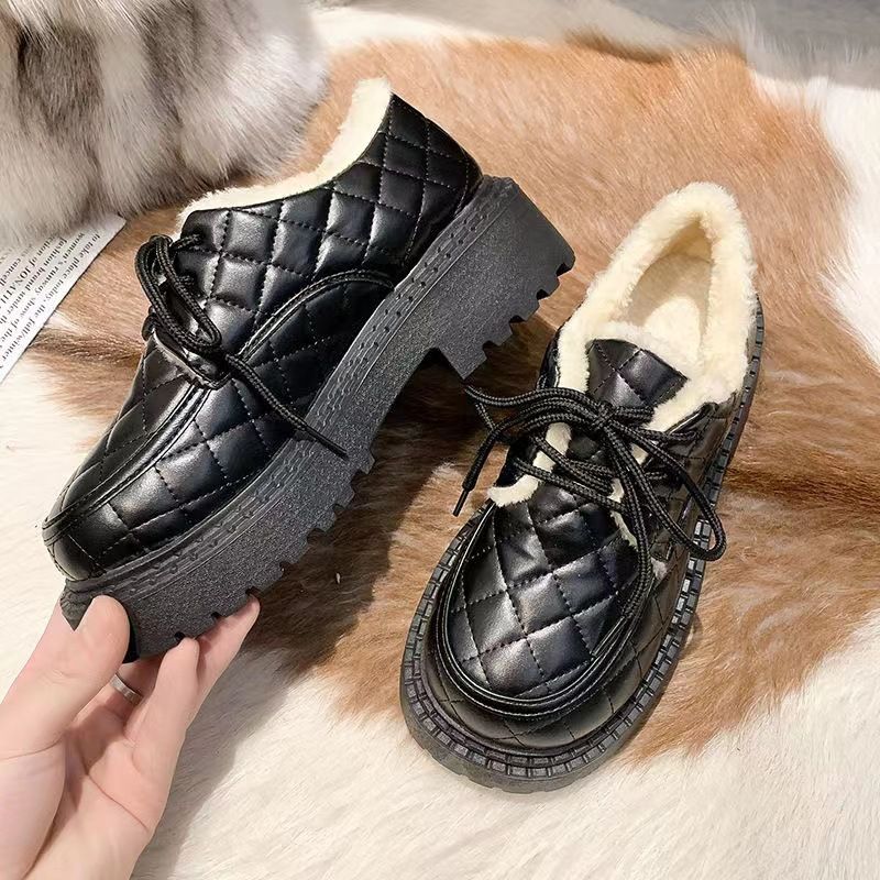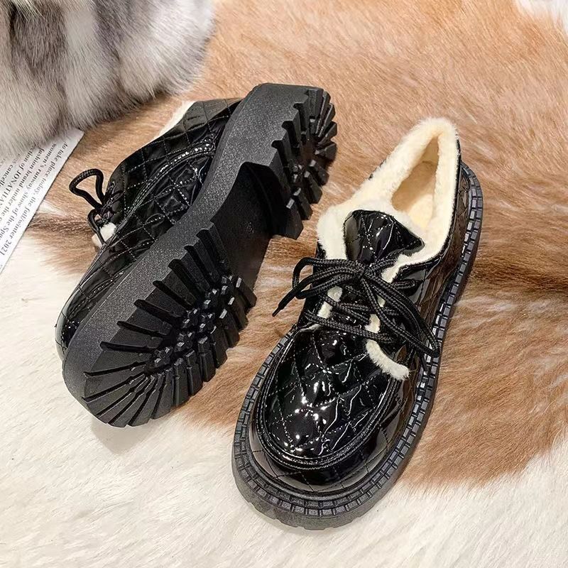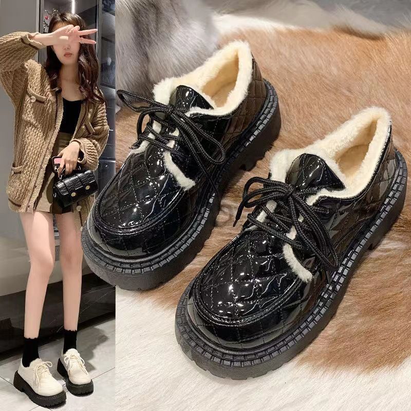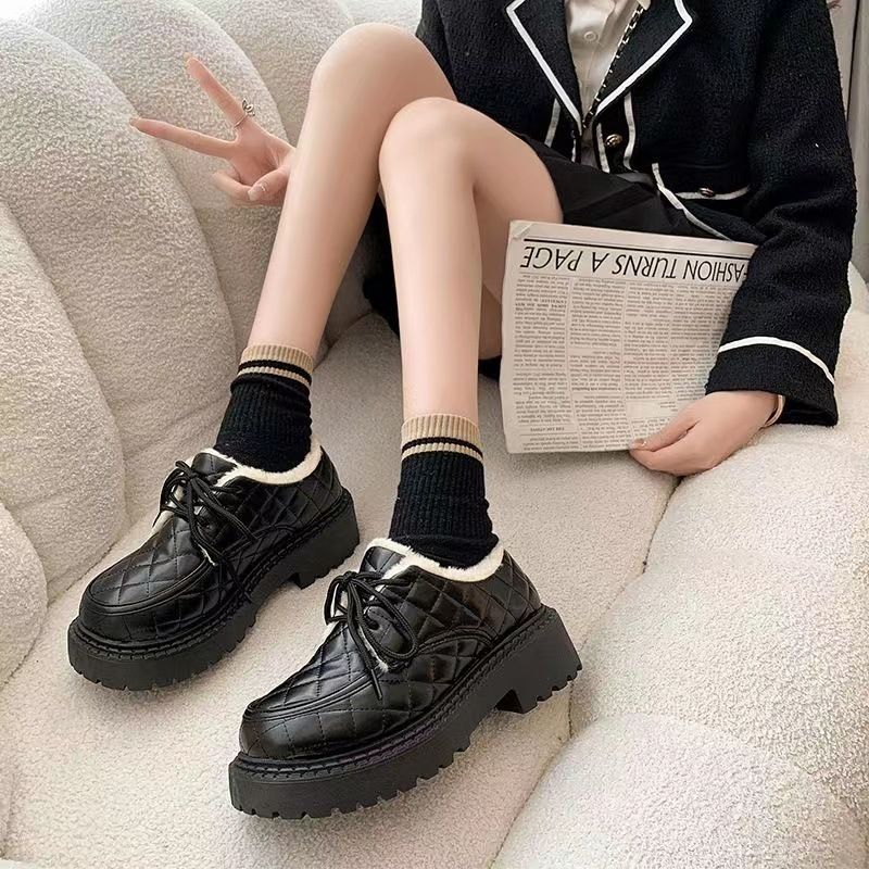 نسخة كورية من ليفو للنساء في الشتاء 2024، حذاء جديد برباط بتصميم بريطاني سميك مع فراء وقطن