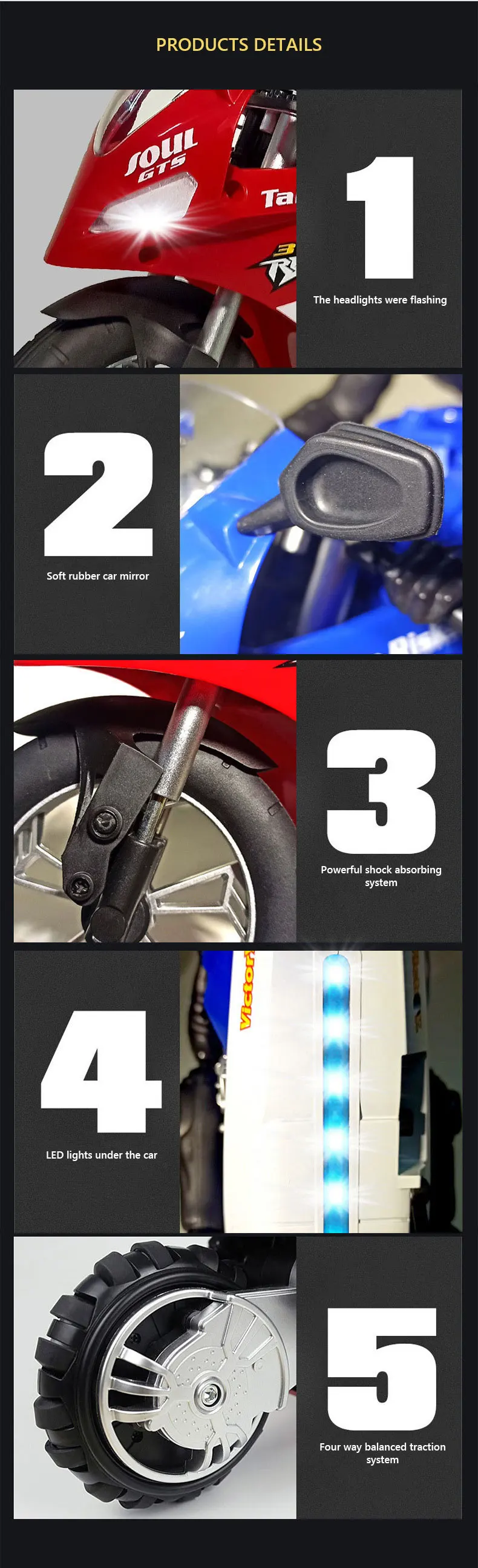3. من خلال التحكم في الجر لعجلة التوازن المطاطية الخلفية ، يمكنها تثبيت التوازن وإفساد ألعاب الدراجات النارية التقليدية التي يتم التحكم بها عن بعد.